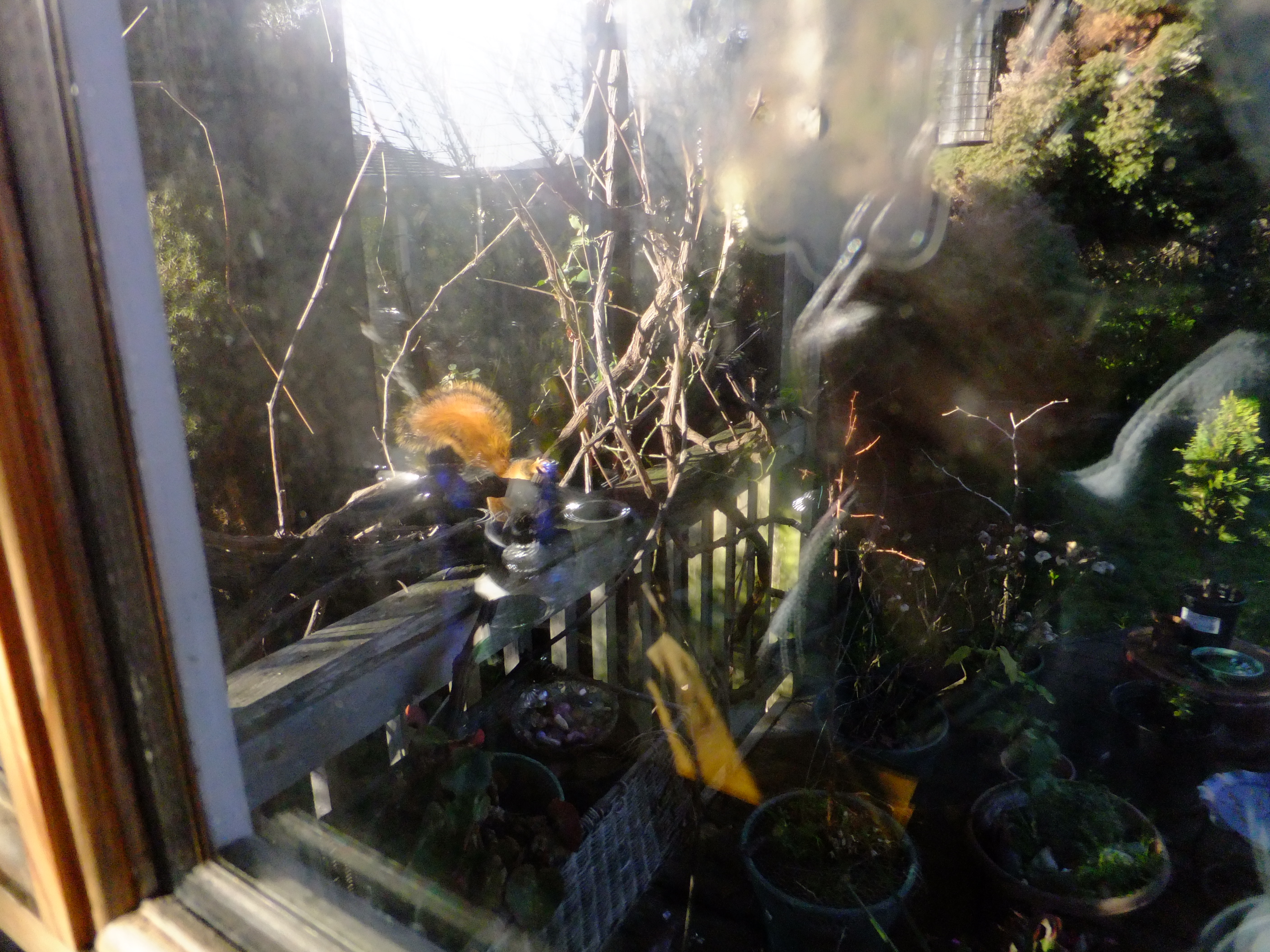I think it must be from my kitchen window, although I can’t get it to match up exactly. Looks like the reflections include some of our blue glasses, a water bottle, and a plastic cup. I love the brightly lit bit of tail that hardly looks like it belongs to the squirrel. He’s sitting on a 2×2 that’s bracing a 25-foot-tall pyracantha. – Ann
