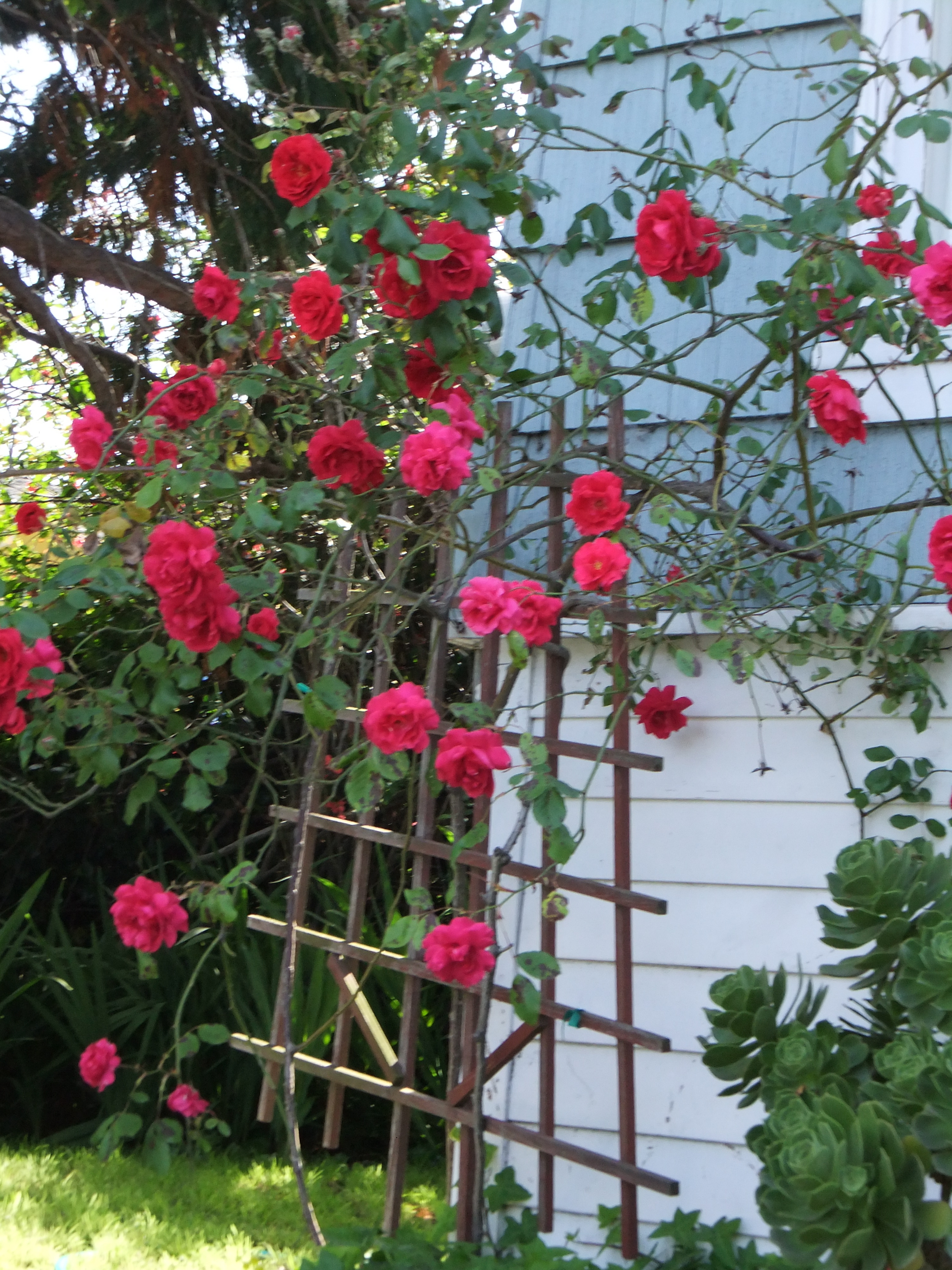 The red don Juan rose against the blue shingles was the reason