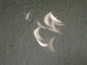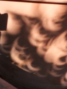 “Look there’s some!”  “over here”  “Wow they’re so clear” Came the calls. It was more like an egg hunting than sky watching.  No one had a camera capable of capturing pictures of the partial eclipse that passed our way yesterday afternoon. So we took photos of the shadows to prove we saw the Moon pass between us and the Sun.