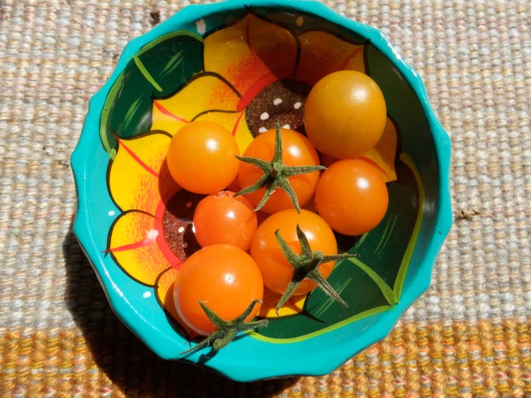 I put these sweet sun gold cherry tomatoes inside a Mexican bowl after I brought them INSIDE (the weekly photo challenge word) from the garden. A bit of a stretch but a chance to share a bright summery picture as many of us in the US look for light words after such a dark day yesterday.