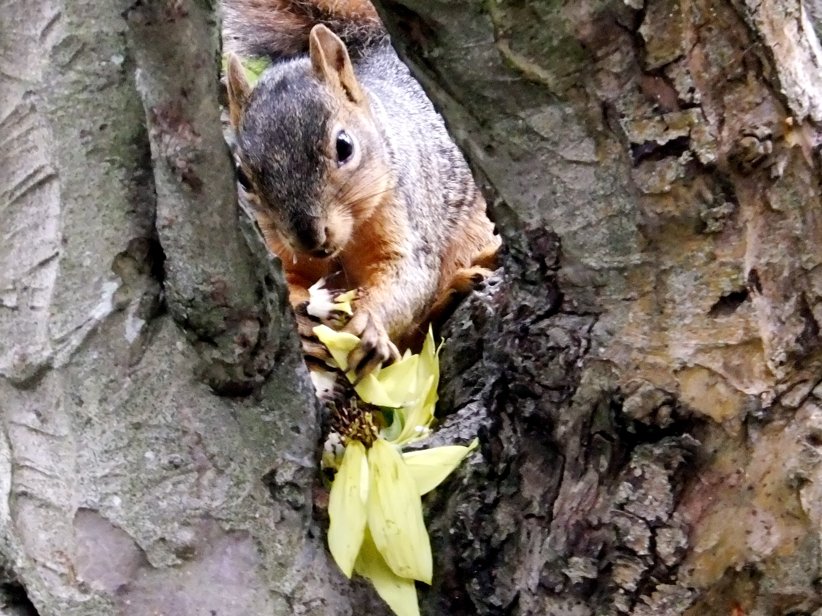 “Honey, you won’t like this! You’ll be mad at the squirrel but he has your sunflower”
