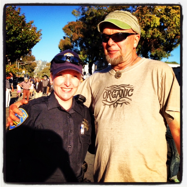 The Story of the Rainbow Man. Is he was once, in his own words, addicted to travel. If you look closely the medallion he is wearing, it is a Tibetan Wheel. Nothing you could buy at your local gift shop. He went for many years never staying in one place for more than 5 months. He has now settled down in a space in Berkeley where he has a dance and art studio and makes his own costumes. He makes a living as a street performer. As many of you guessed he really does want to make people smile. At the end of a very long day he got the lovely police woman laughing and smiling and giving him advise on the best spot for his next performance. I suspect she is quite the Bodhisattva herself.