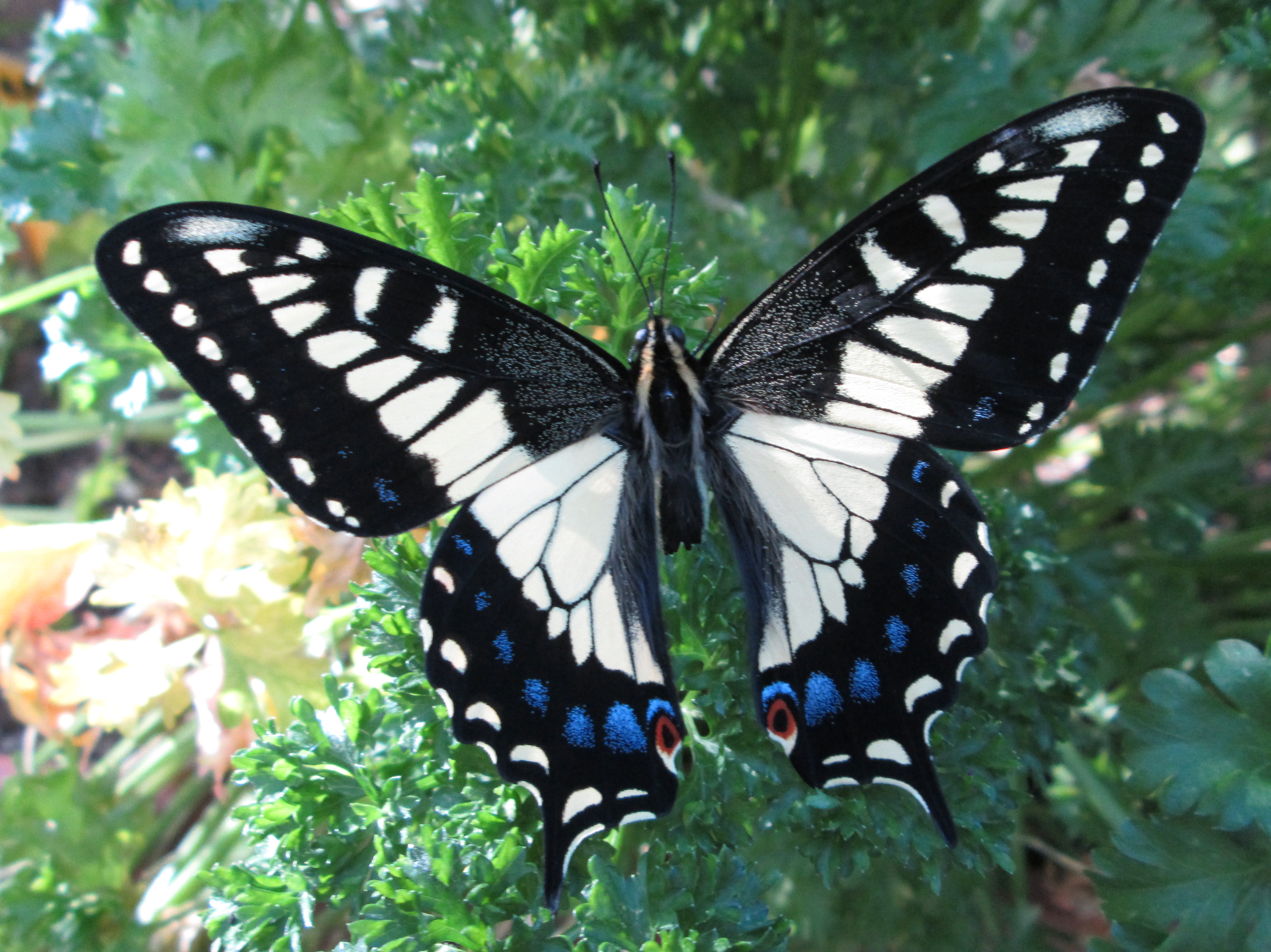 Since none of my photos of the monarch migration where less than wordpress worthy. (little orange dots in the trees) I was happy to find this Swallowtail on my cabbage. Perhaps she is the mother of the caterpillar I posted a few weeks ago. While I was photographing and preparing to send it to my friend she sent me photo below.