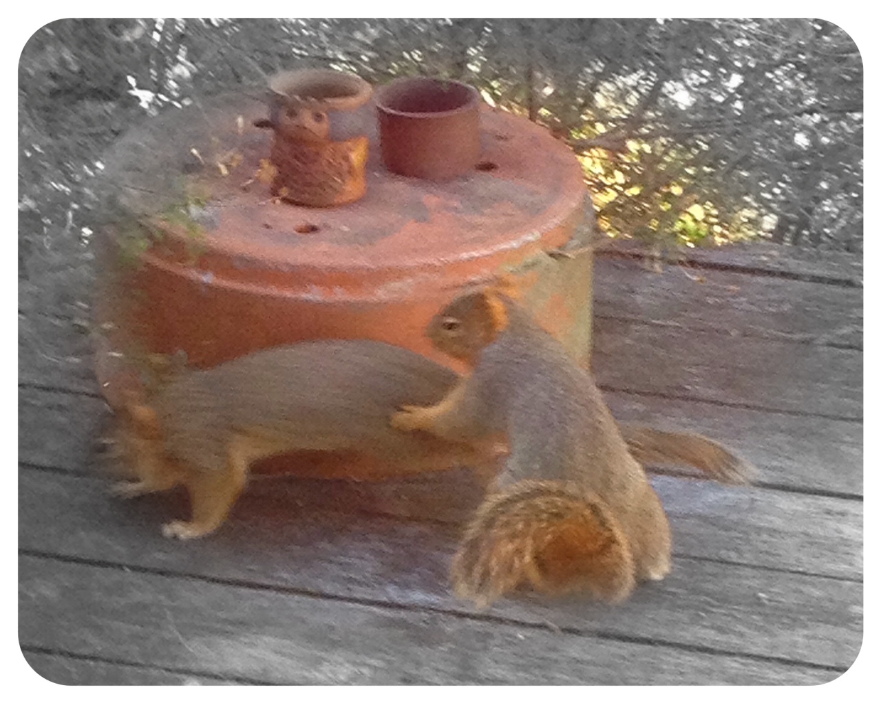 The backyard wildlife is popular with our visiting students. This squirrel posed quite a while with the flamingos yesterday until he started digging in the wine barrel then I had to interrupt this bucolic scene. Does anyone remember that I posted almost the same photo sans squirrel last week?