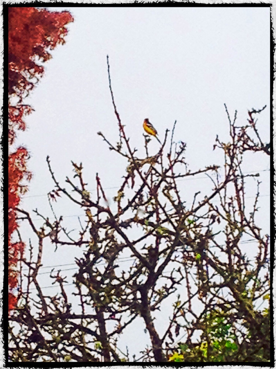 I’m thinking an oriole. I have one that comes once a year and actually drinks out of our hummingbird feeder of all things. What a cheerful thing to awaken to. I’m awakened in the morning by a cat and a dog telling me it’s time to meditate (after their breakfast of course) 😉