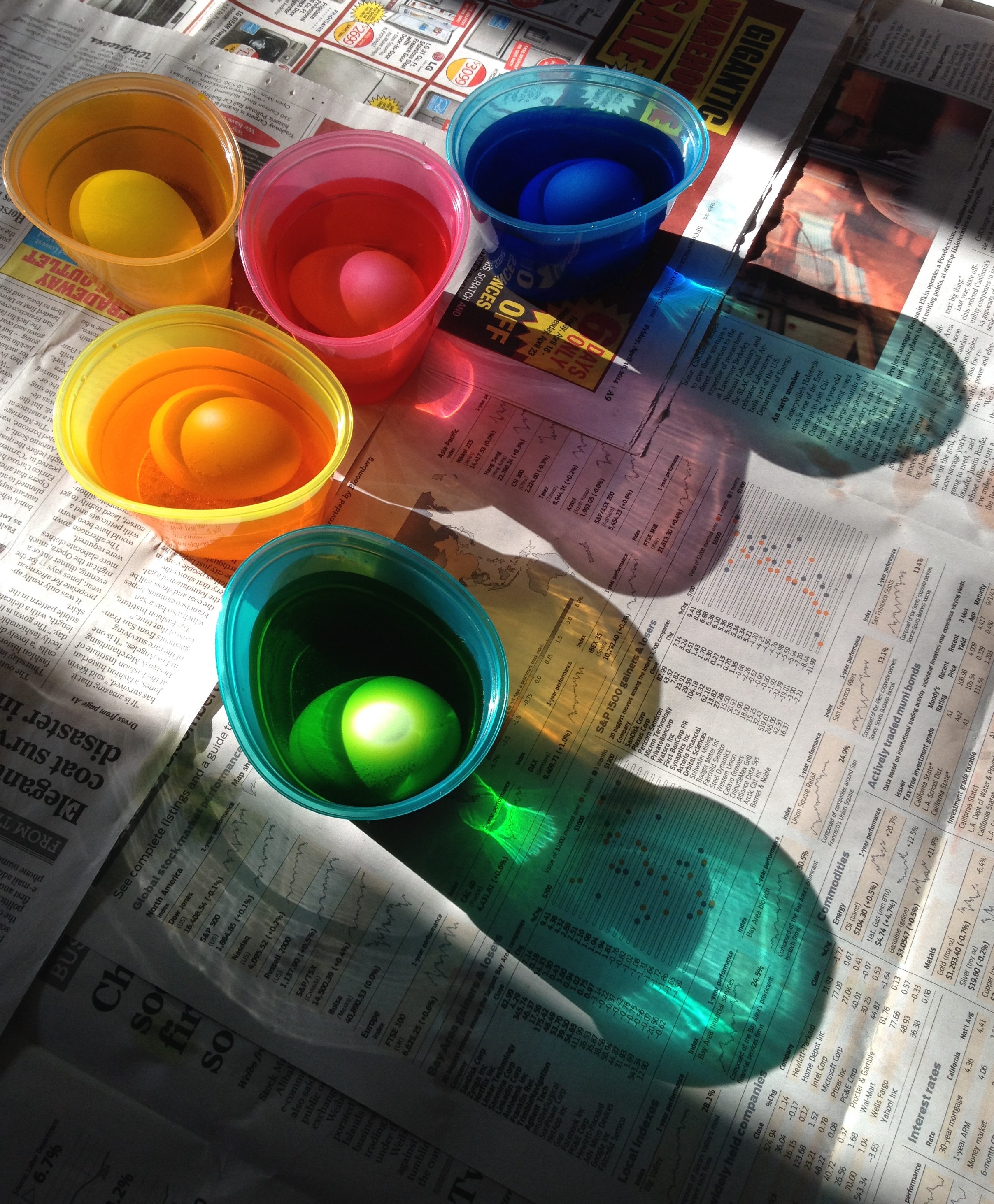 Eggs are probably our oldest symbol of birth and renewal, reminders of the incredible persistence and variety of life. Dying these elegant packages the colors of dawn we join the spinning Earth bathing in the light of a new day. No matter my age I still thrill at how the once white egg is transformed by a quick swim in a cup of colored water.