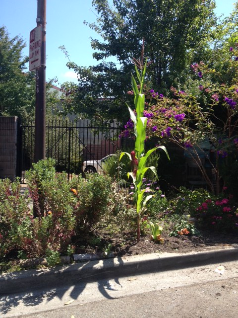 When I saw the Weekly Photo Challenge was Fray I immediately thought of tasselled and frayed ends of corn silk which is abundant this time of year,a symbol of the end of gift of summer which is quickly coming to and. I had no images of them. Doing errands today I came upon this single stalk red of corn planted in a patch of land next to a parking lot off College Ave in Berkeley. The owner came out while I was there and said she didn’t plant it. So it is a volunteer or the work of a gorilla gardener. Only IN Berkeley!!