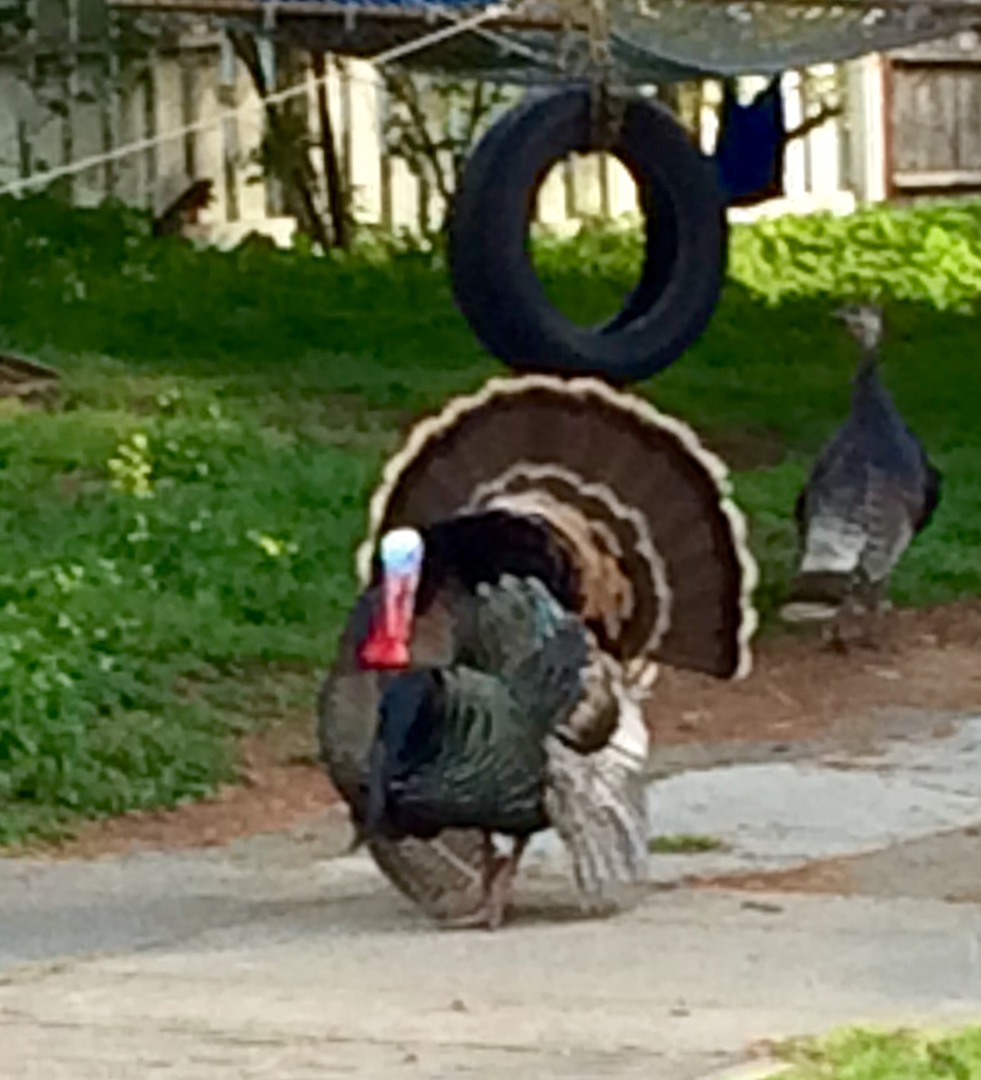 As I have mentioned before turkeys live on our block. I wake up to gobble gobble, when I went out to watch the sunset I heard the familiar call. Pretty soon there will be more turkeys if  swinging Tom has his way: