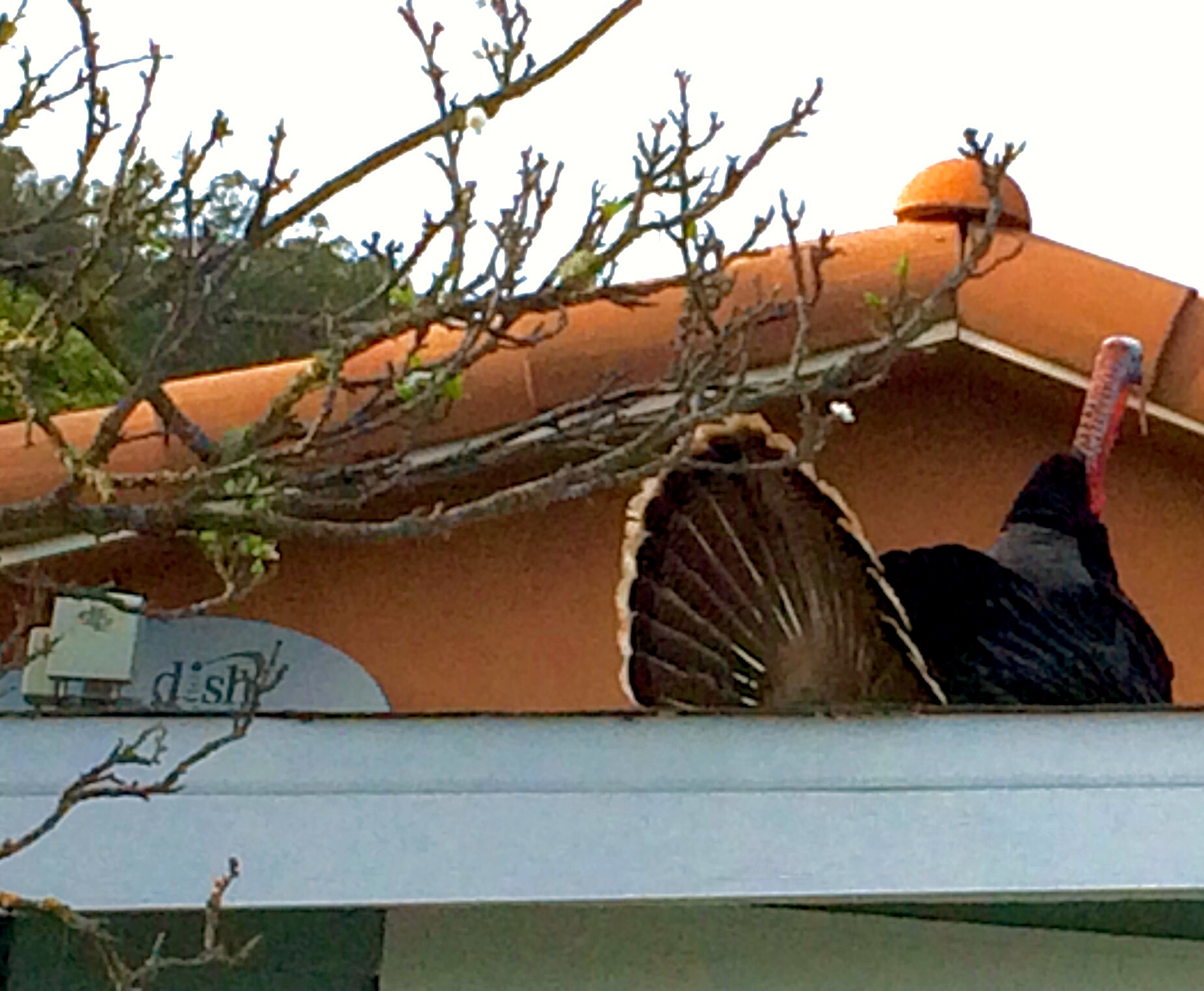 I seem to be going to the birds. Yesterday was flamingos and today it’s turkeys. These big birds are all over the neighborhood I’ve stopped taking photos of them but couldn’t resist this one showing off on my roof befriending the satellite dish. And it is perfect for Cee’s Odd Ball Challenge as well as Weekly Photo Challenge Orange