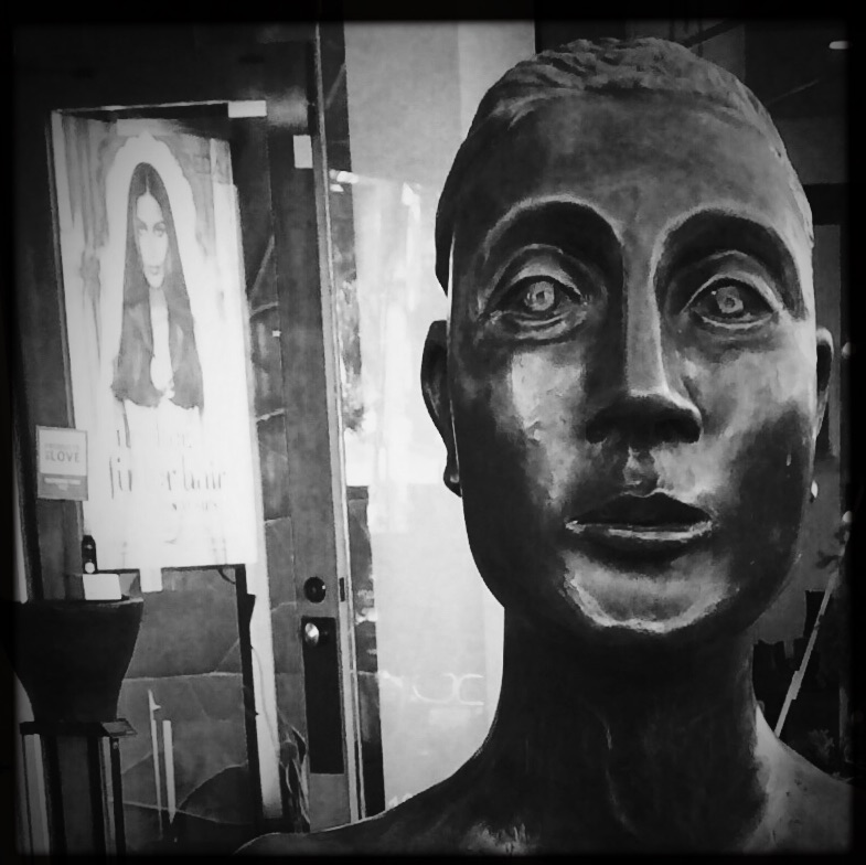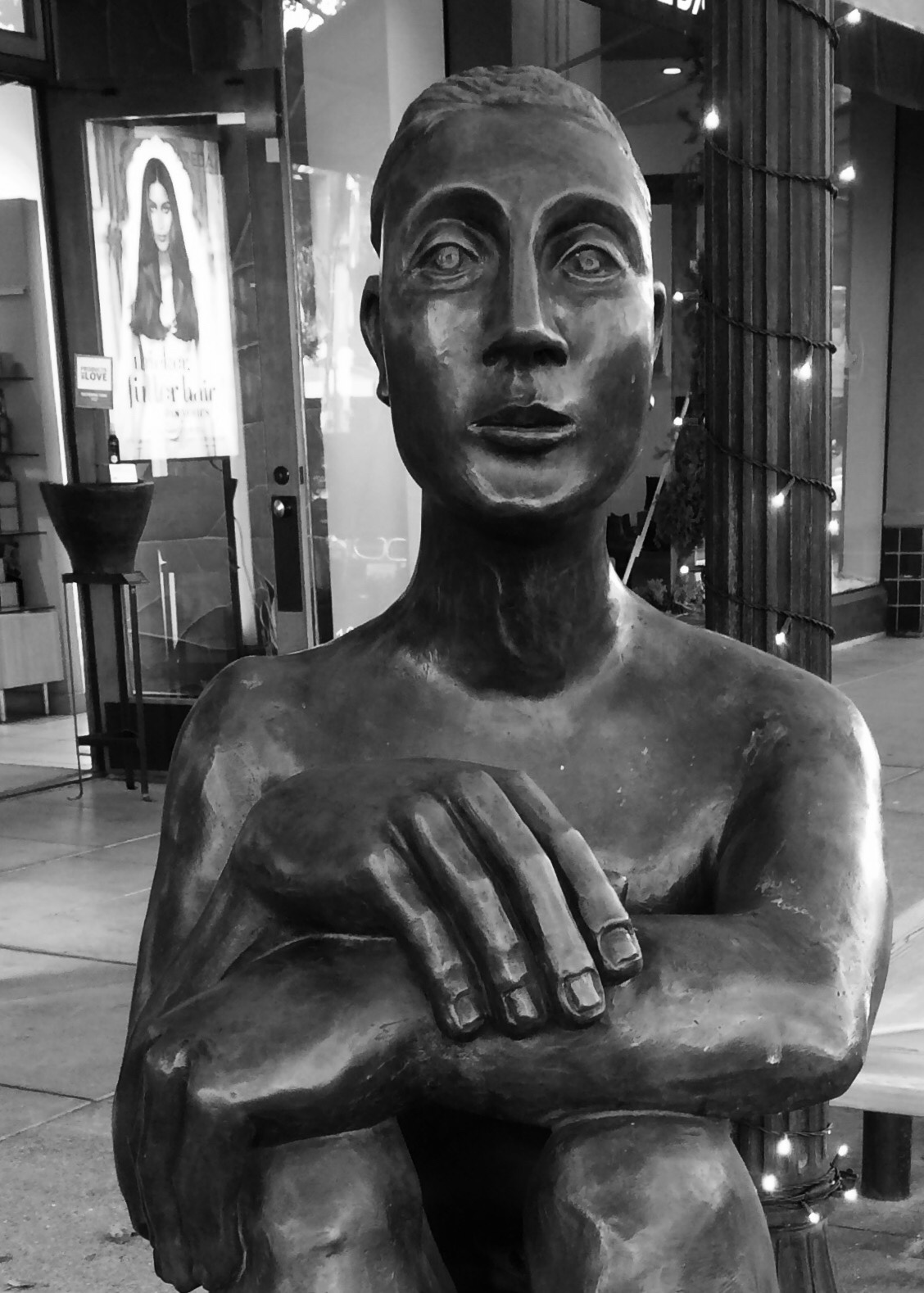 Pablo is a life-sized sculpture that sits quietly on the corner of Forth Street and Hearst a busy upscale shopping area in West Berkeley. Children climb on him, tourist pose with him but many folks just pass him by, ignoring his oversized feet and hands and penetrating gaze. I’ve never tried to photograph him because I aways thought it would just be just a documentation. Then last week this perfect moment presented itself. The setting sun lit him up and the newly installed Holliday lights came on AND a Madonna like figure appeared over his shoulder thanks to an open door. Add the beauty and drama of B&W Pablo tell a nice start.