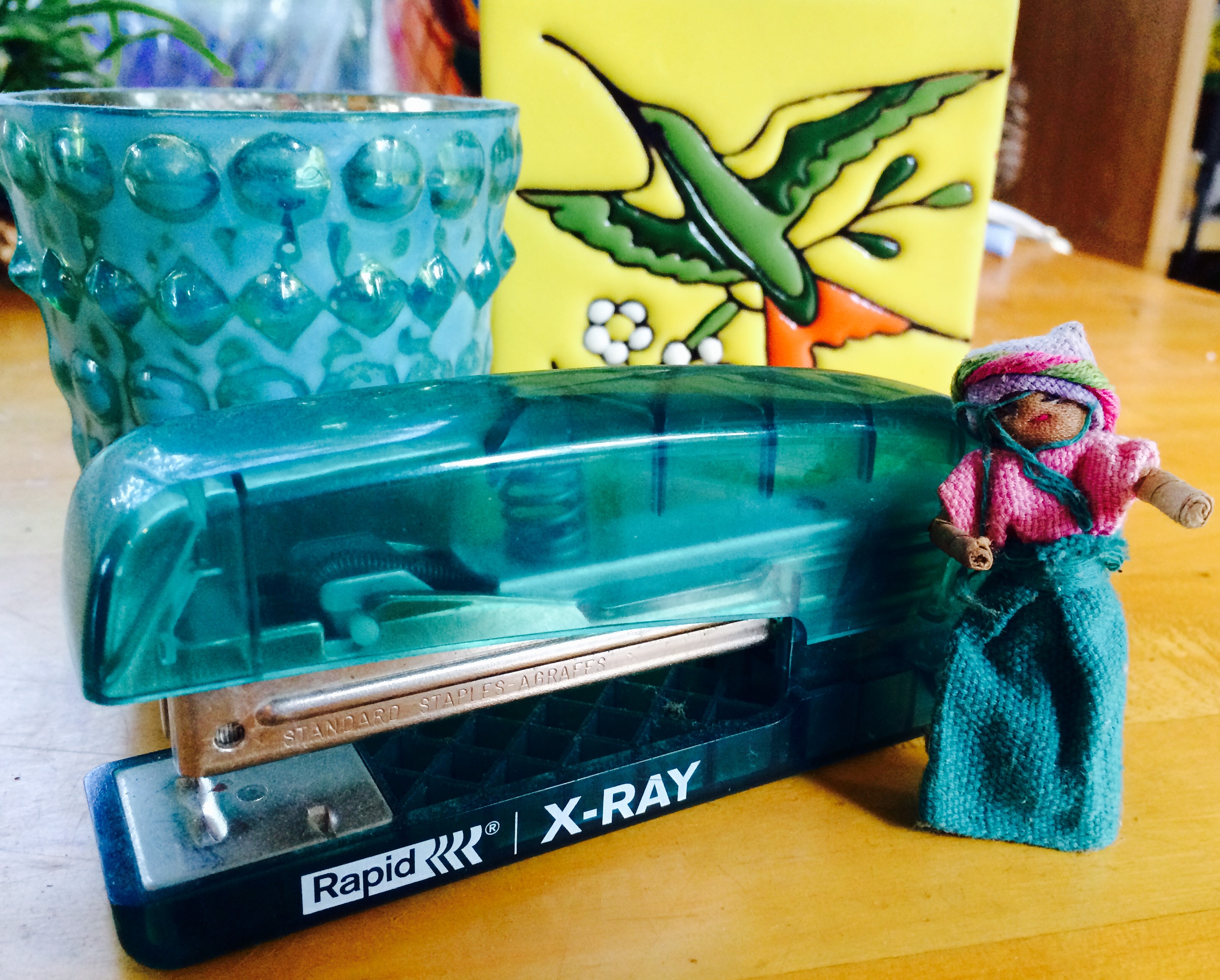 Nice looking arrangement of items for the color. I like the worry doll. 🙂