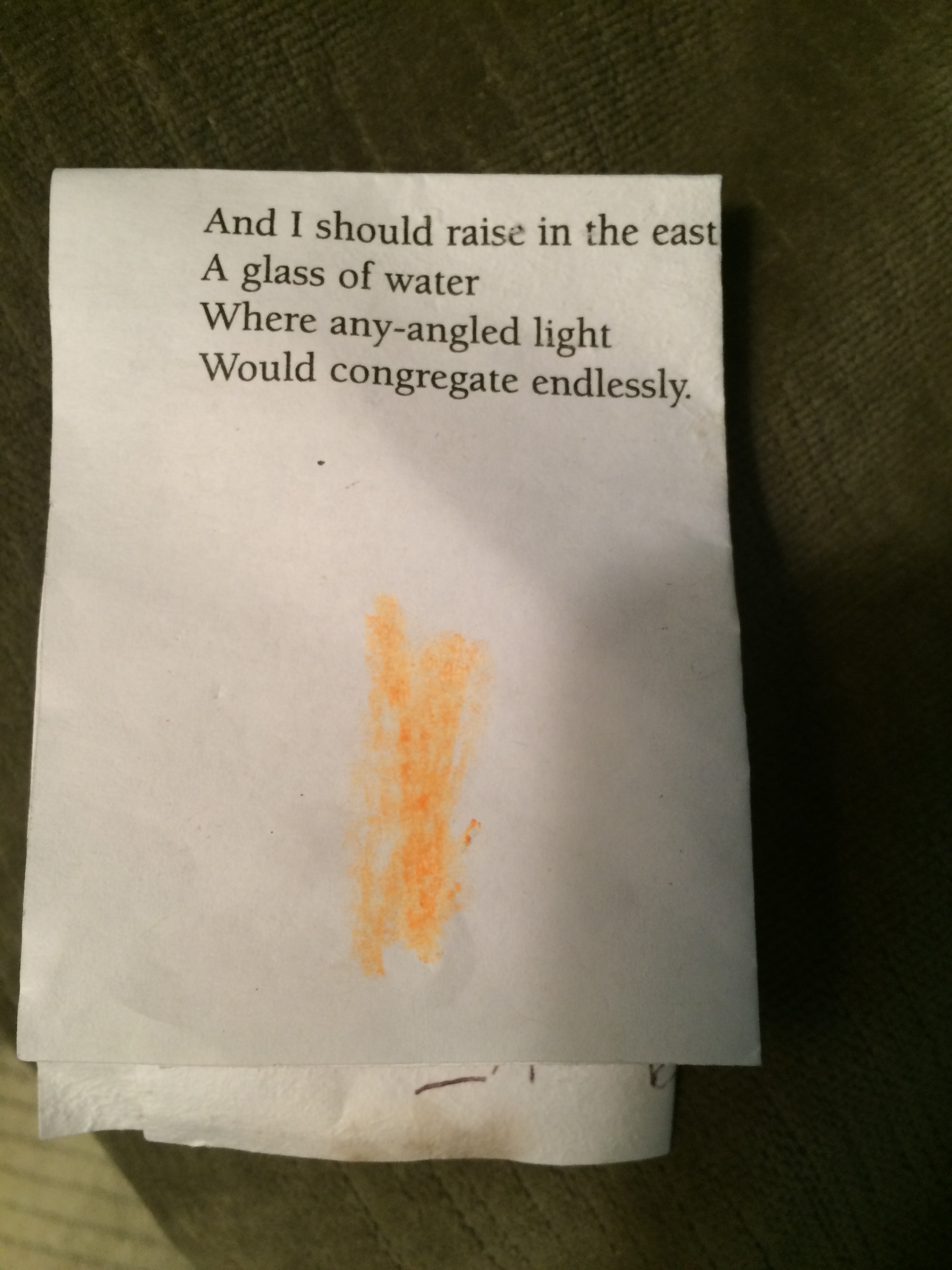 I found photographing anything that is orange is tricky. The least tip of the camera changes the color dramatically from washed out cream to blazing sunset tangerine orange. I doesn’t help that the actual Crayola color doesn’t seem to match the chip today so I scribbled the crayon called Vivid Tangerine on a scrap of paper to see it for myself. Turns out the poem scrap has an opinion of its own about color or should I say light.