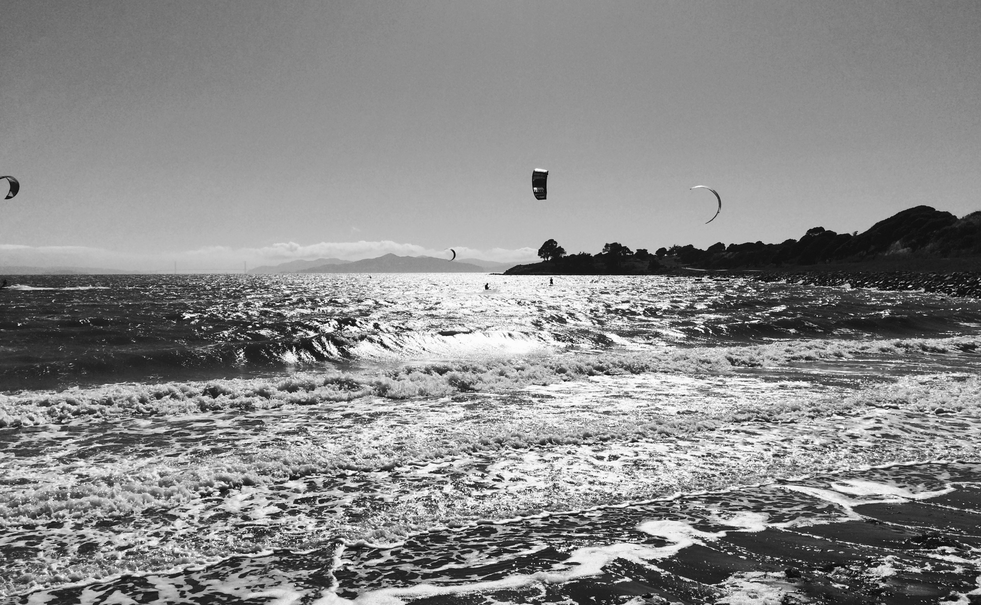 Yesterday I noticed photogenic clouds so I headed down to the bay to see what I could capture. To my surprise kite surfers were out in full force. I assume because the tide was high and there was good wind. Blinded by the sun and the wind in my face shoot away. Holding the Phone steady I touch the screen and hoped for the best. These are 2 images that capture the feel of the day. Black and white seem to add to the drama. Enjoy