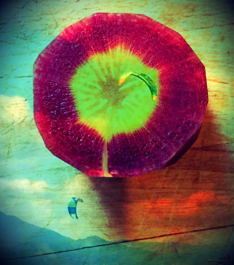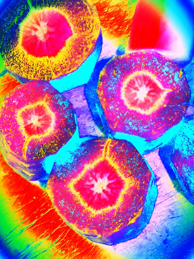 The red carrots I  sliced surprised me with the yellow centerI took some pics just for fun as they lay on the cutting board. Looking at the results I thought suns. The day before I took some shots of kite surfers and clouds near the toll plaza so the Bay Bridge. Theses are the results.