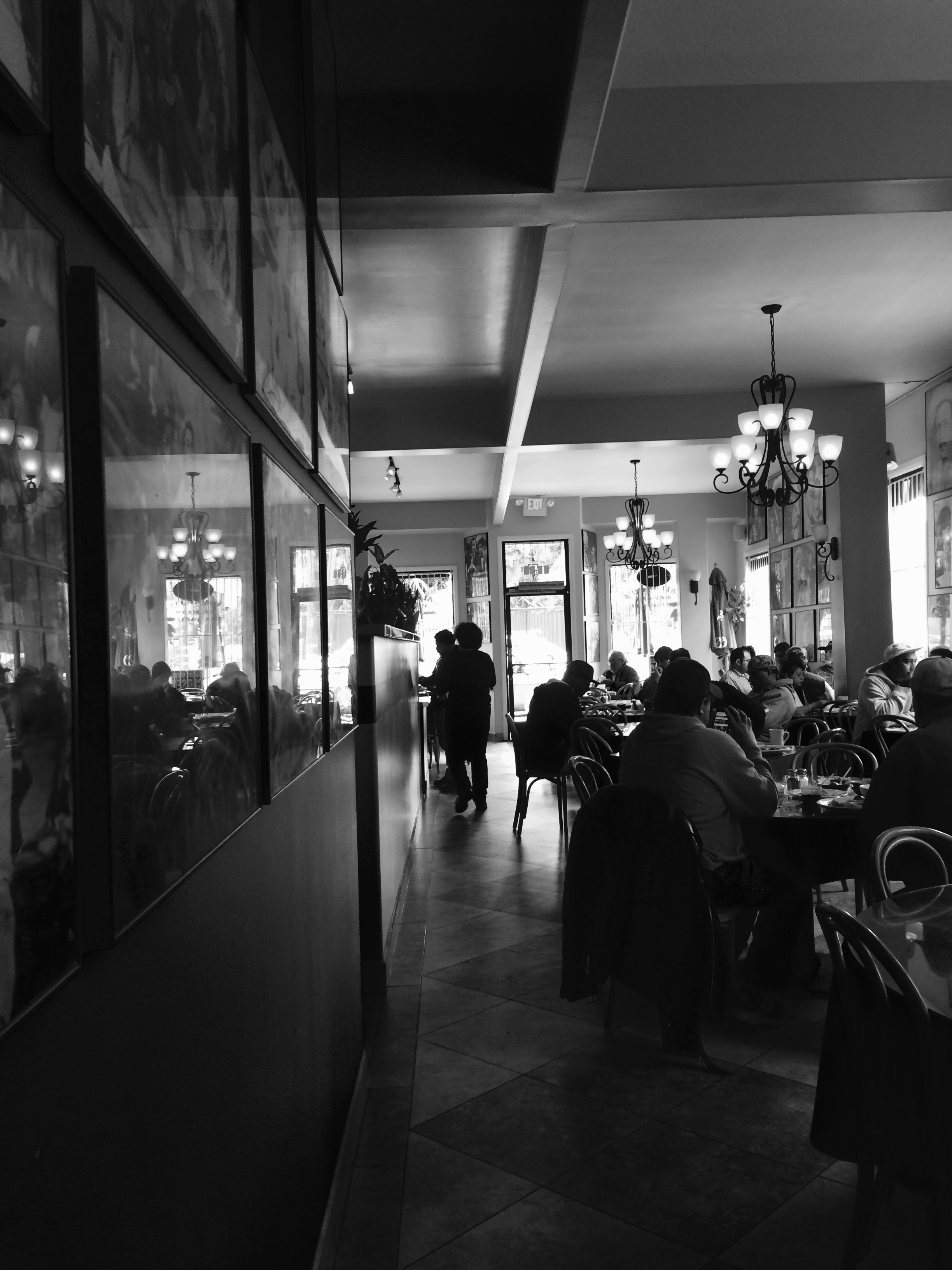 I like really busy pictures that give me a lot to look at. I this photo of a Mission Cafe I was fascinated by ho the light fixtures reflected off the pictures on the wall.