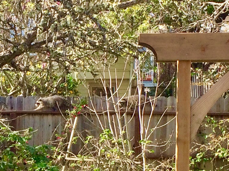 I’m really being a backyard wild life photographer today. While I was answering comments on my earlier Daily Post Creatures two of the biggest raccoons ran across my back fence. I grabbed my trusty iPhone and captured them enjoy
