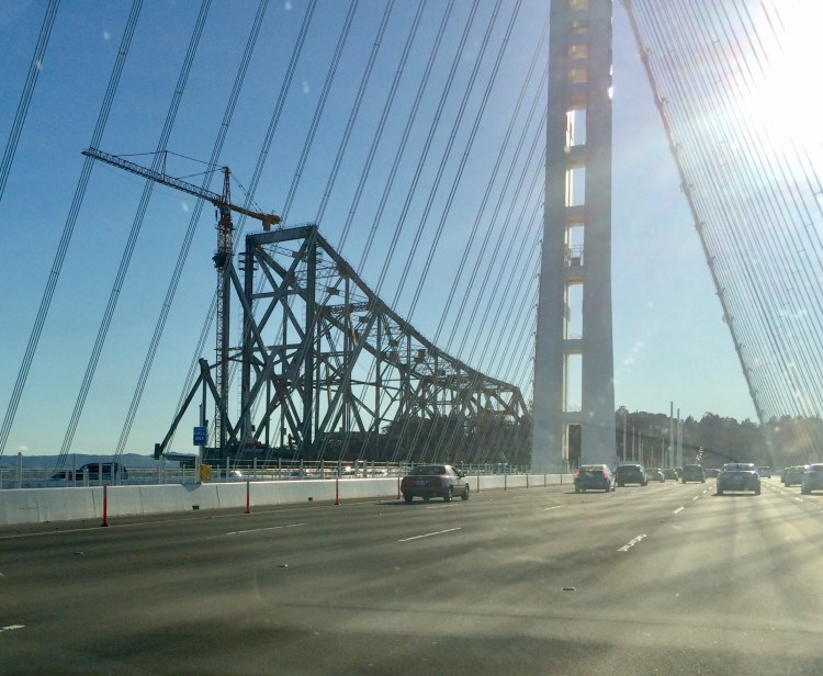 New Bay Bridge next to Old Bay Bridge being deconstructed/sepia tones