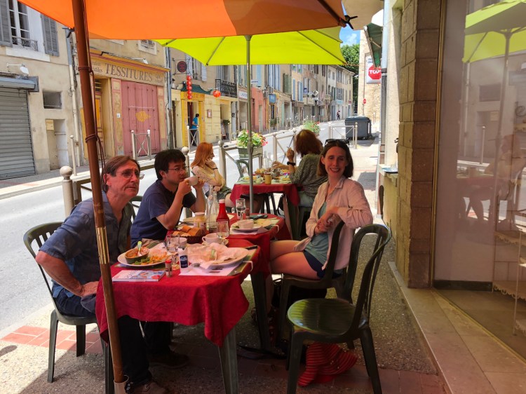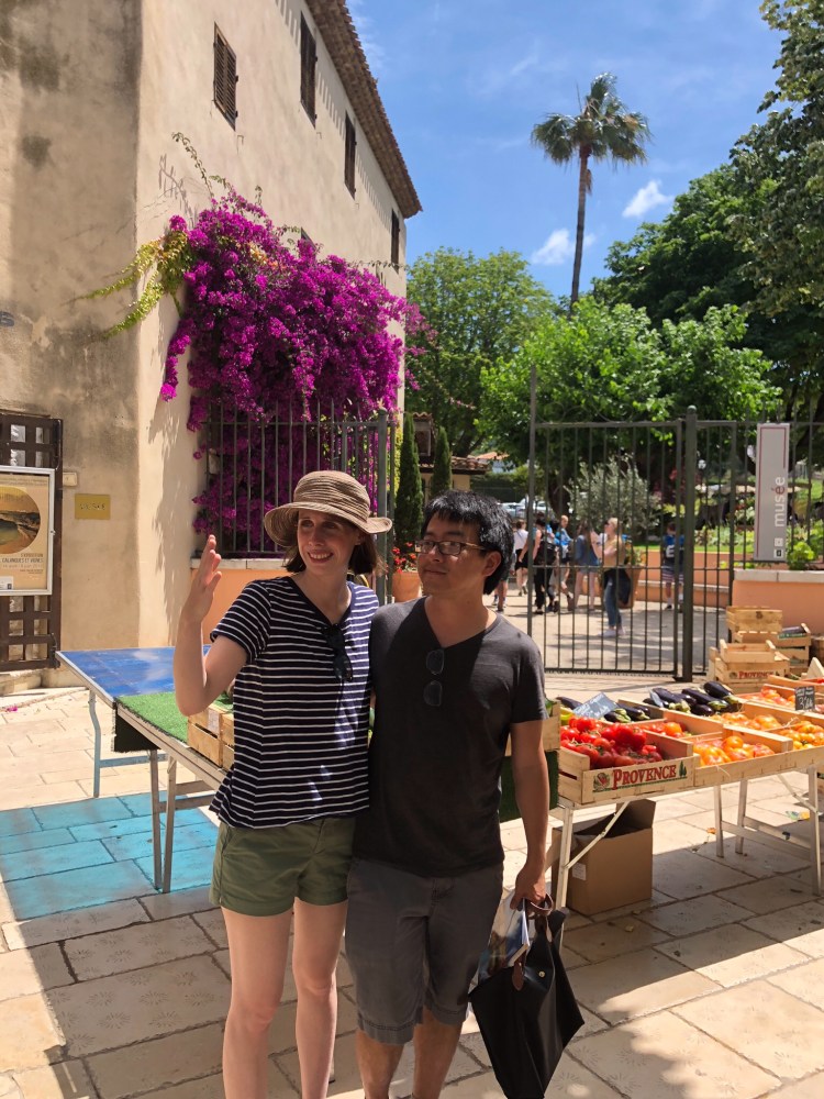 This image from France could be California summer with the palm tree, fresh vegetables, bougainvillea And my daughter with her new husband.