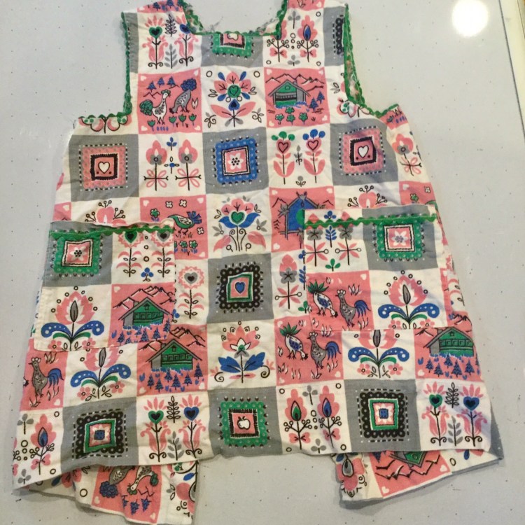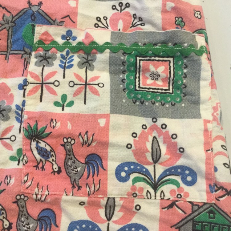 I came across this pinafore while excavating the spare room just in time for the final week of September Square. My grandmother made it for me when I was 2 or 3 so it is probably is close to 70 years old. She was an artist learning Pensilvania Dutch painting about this time. I am touched looking at the loving care she put into every stitch. Note the rick-rack details on the pocket.