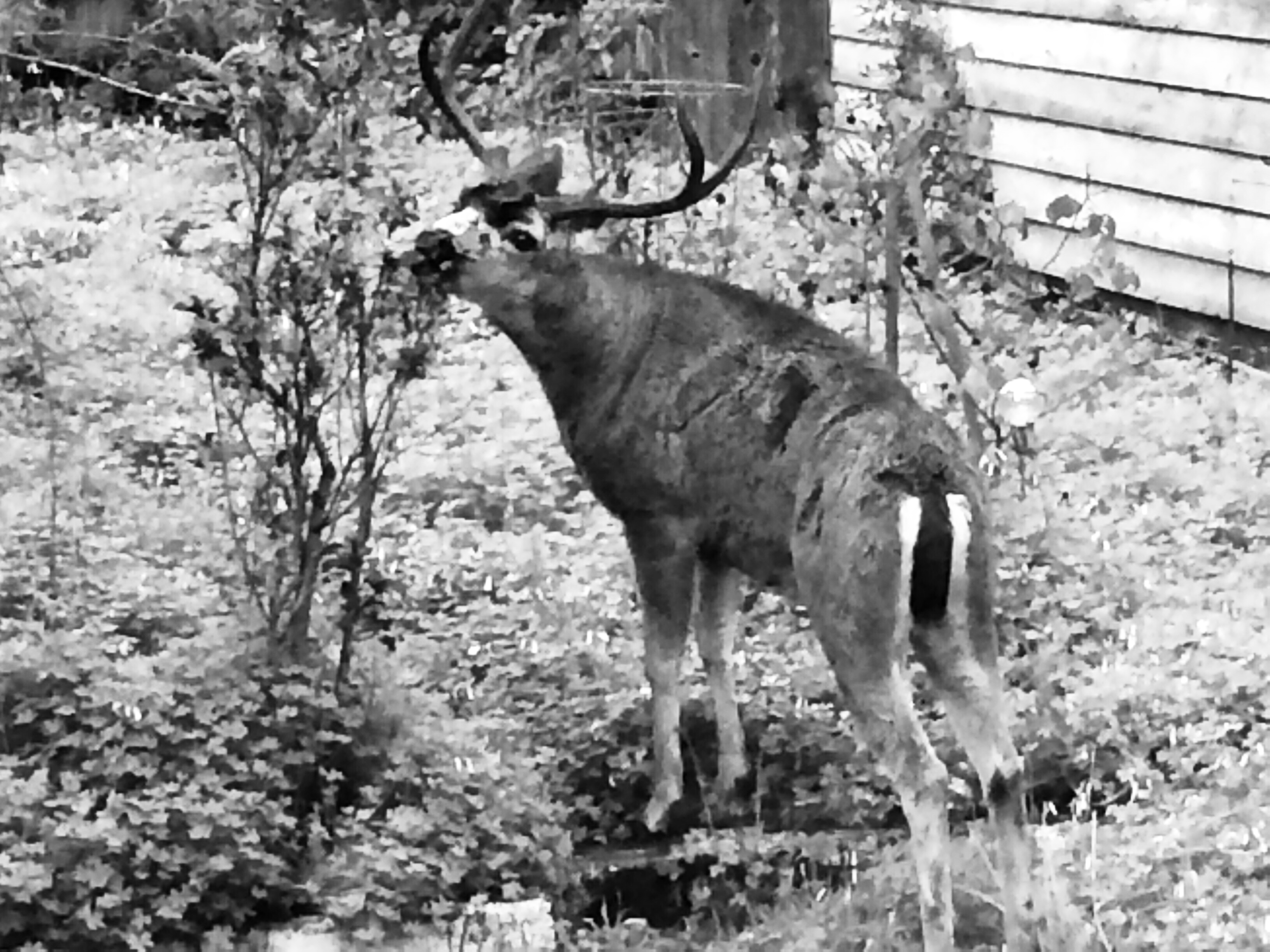 October 25, 2018 Ceeing Tails and Tongues in Black and White 3264 × 2448 IMG_0049 Deer putting his tongue on my flowers