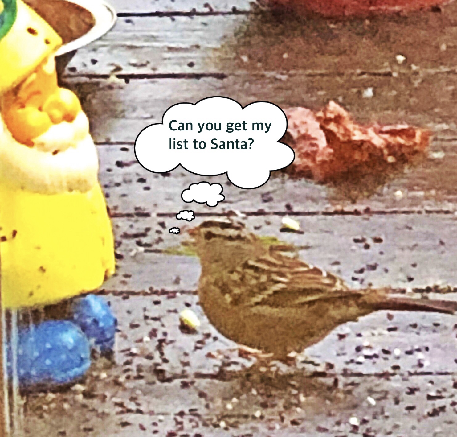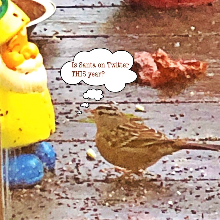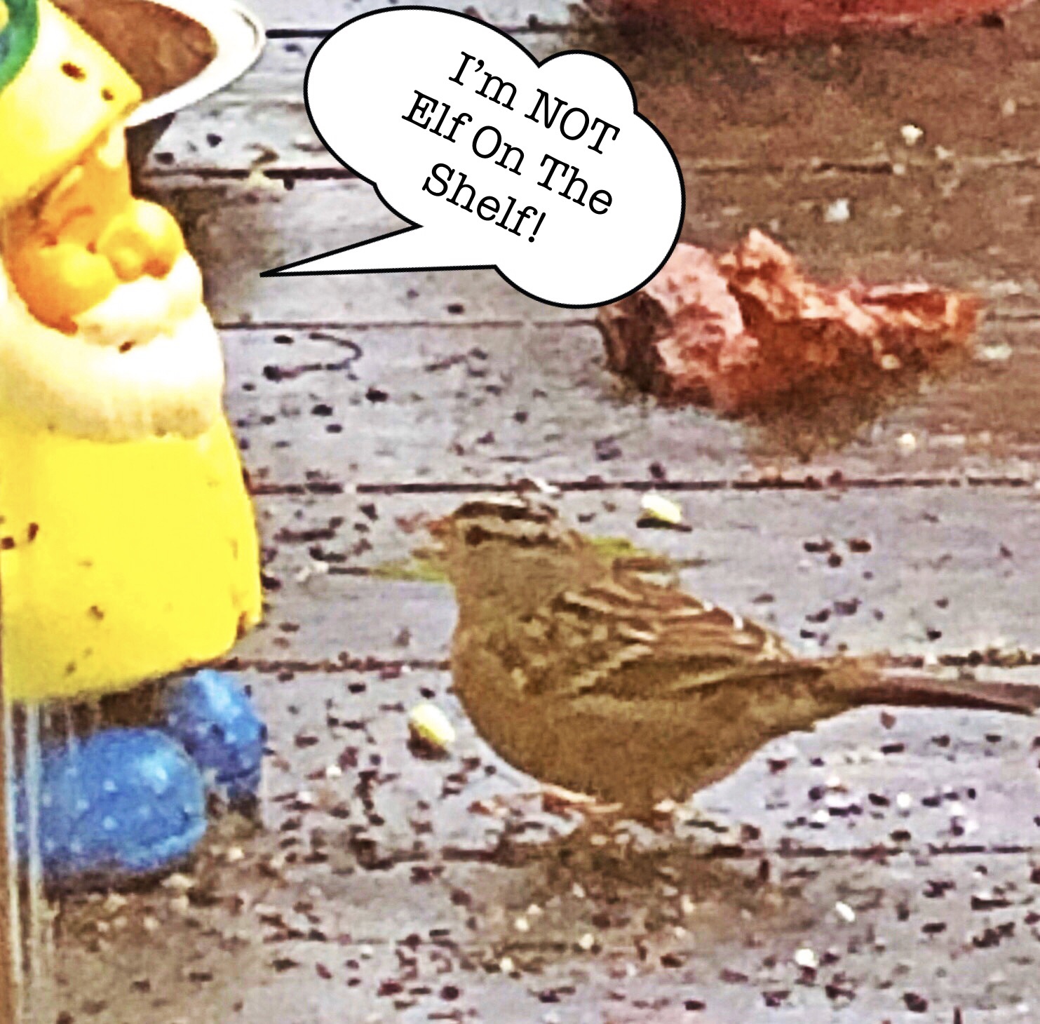 Yesterday I asked for captions for a photo of a bird seeming to have a conversation with an elf. I created word bubbles for the the ones I got On WordPress and Facebook and Added my own like this one