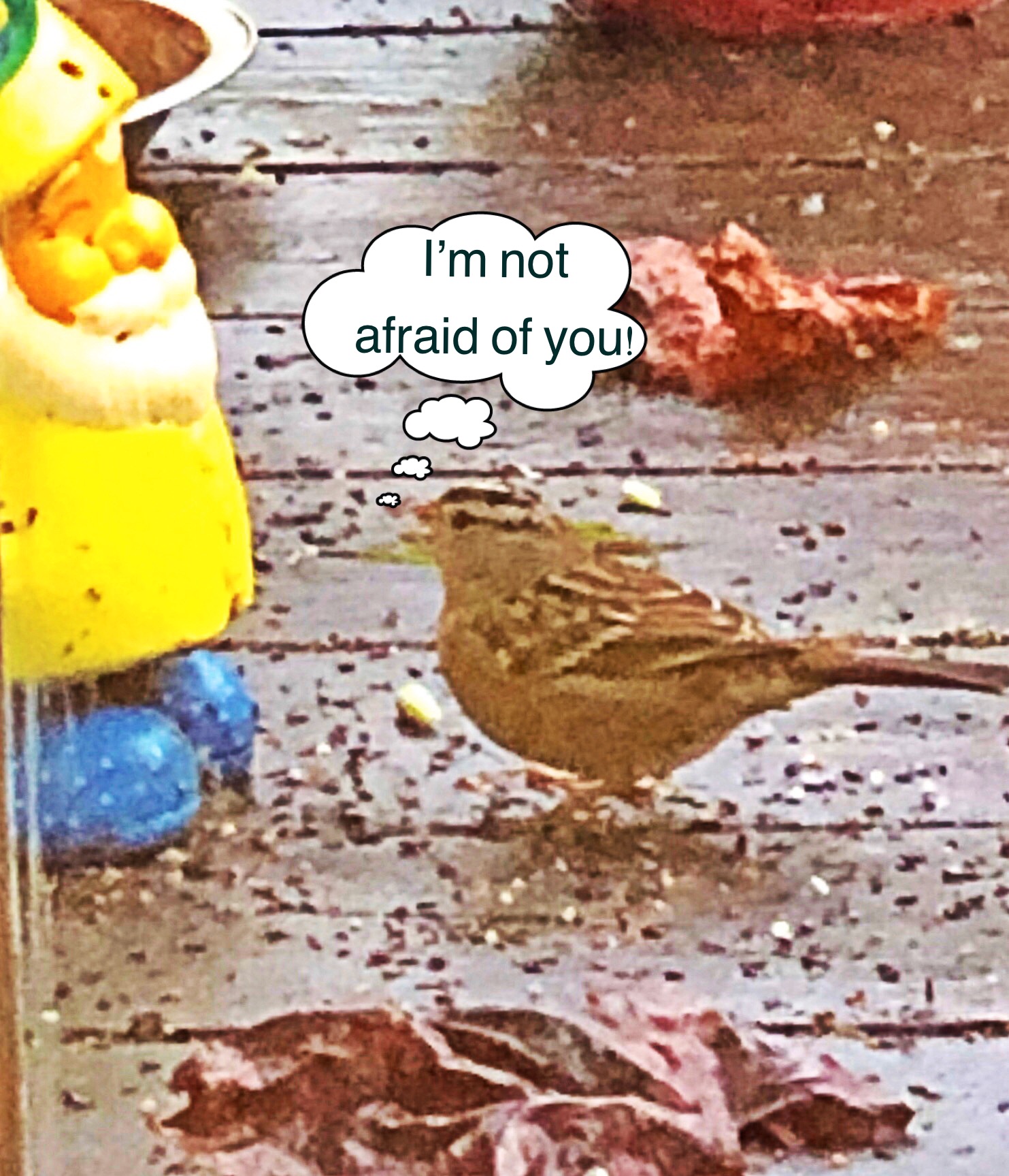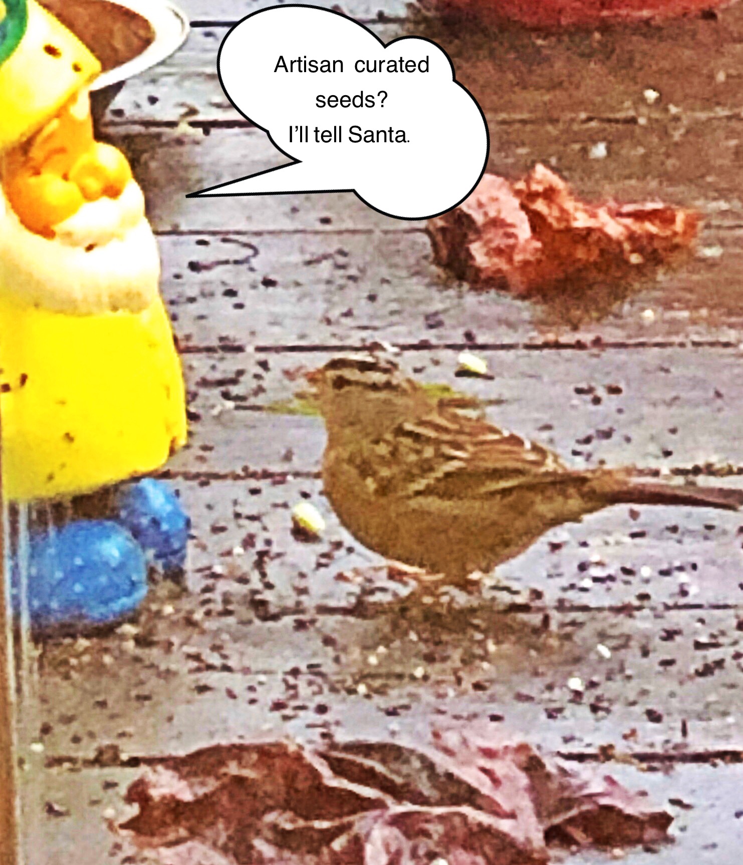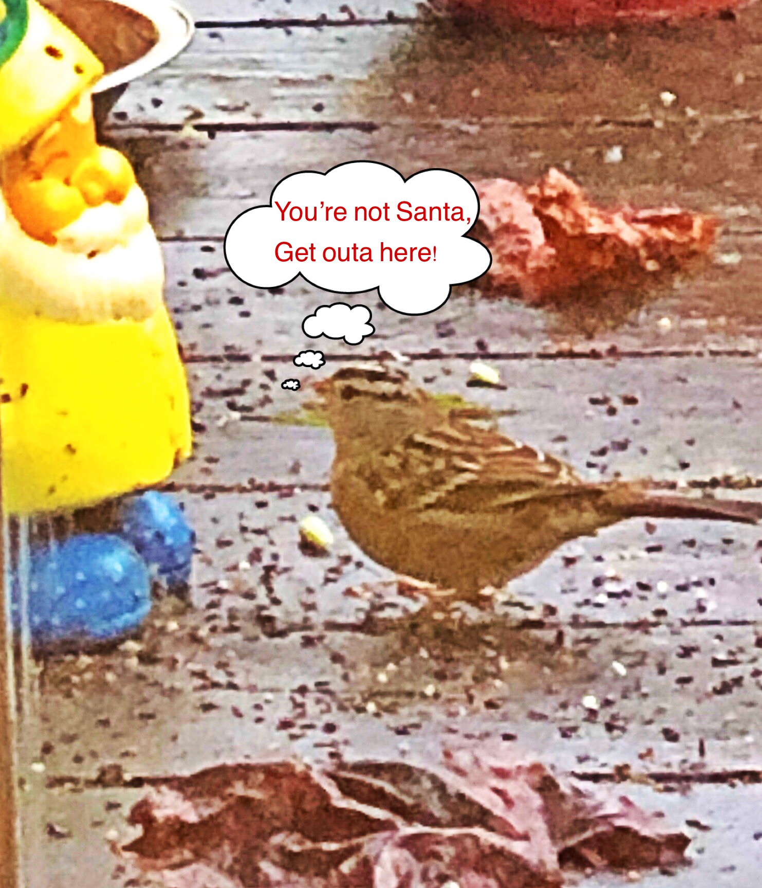 Yesterday I asked for captions for a photo of a bird seeming to have a conversation with an elf. I created word bubbles for the the ones I got On WordPress and Facebook and Added my own like this one