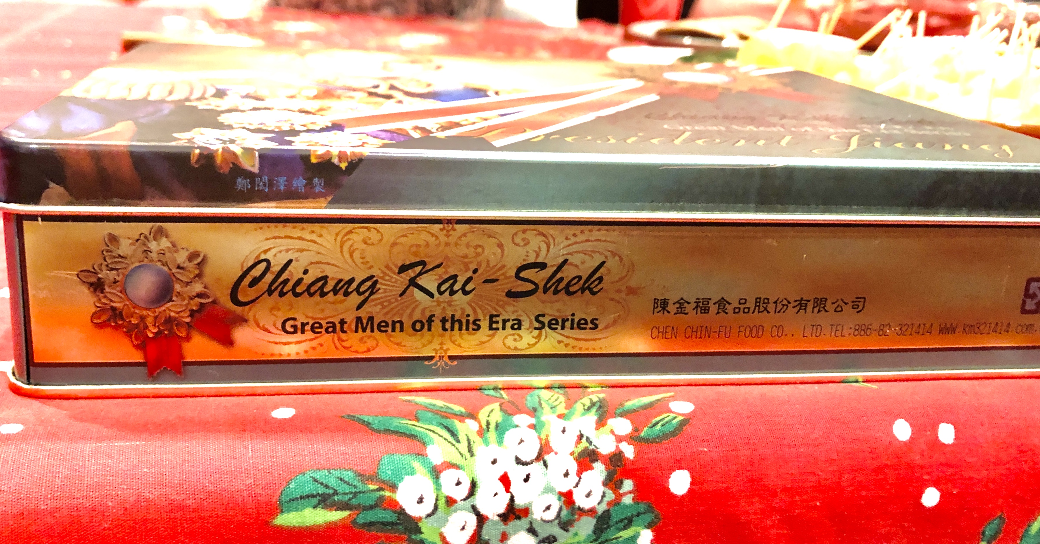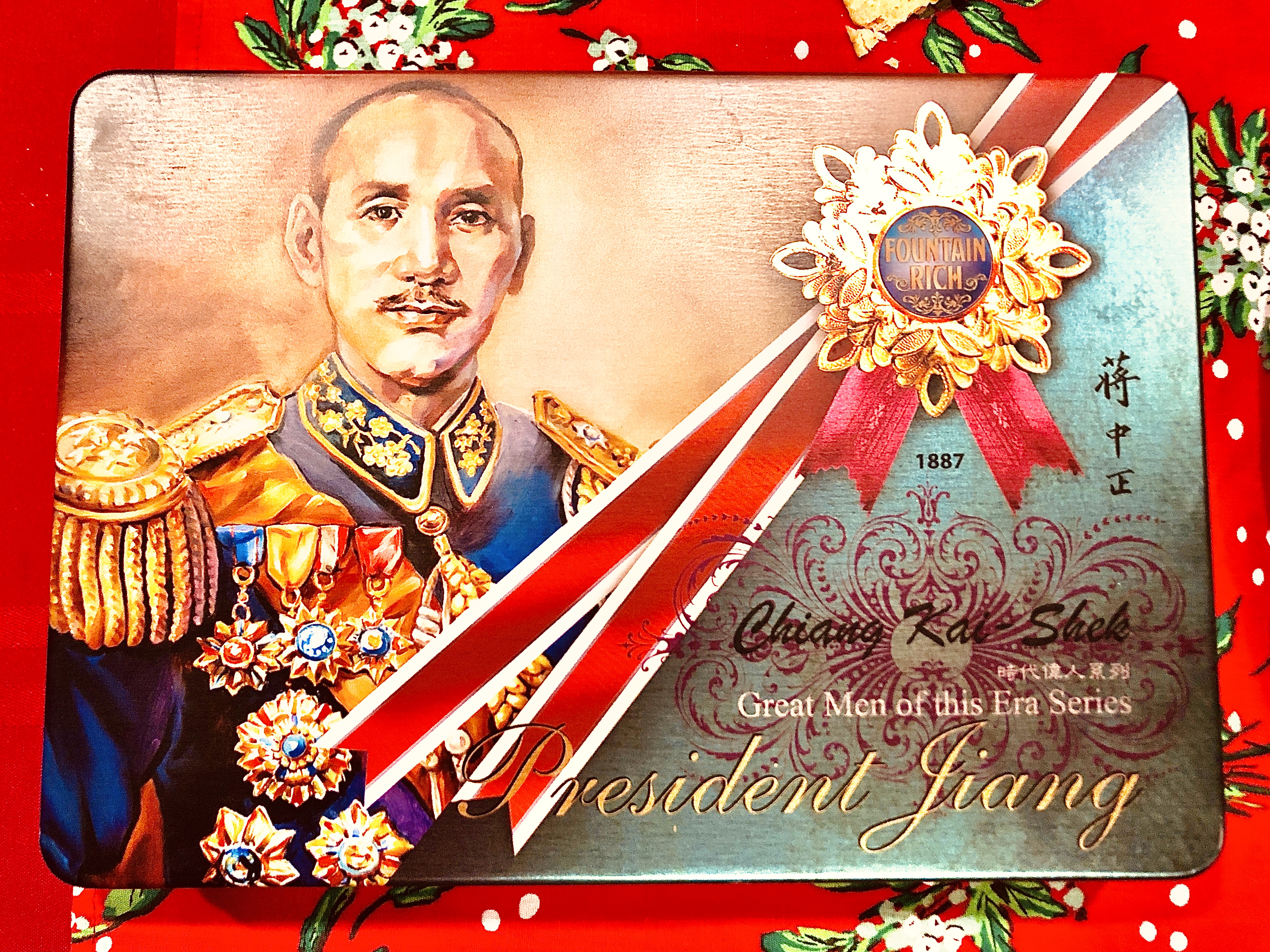 My son-in-law just returned from a family visit to Taiwan and brought this very interesting tin to our Christmas party…it was quite a conversation piece. The history of that tiny island is so complex. Who knew a cookie tin could be political? This one must be old school because spellcheck kept correcting Chaing to Xiang.