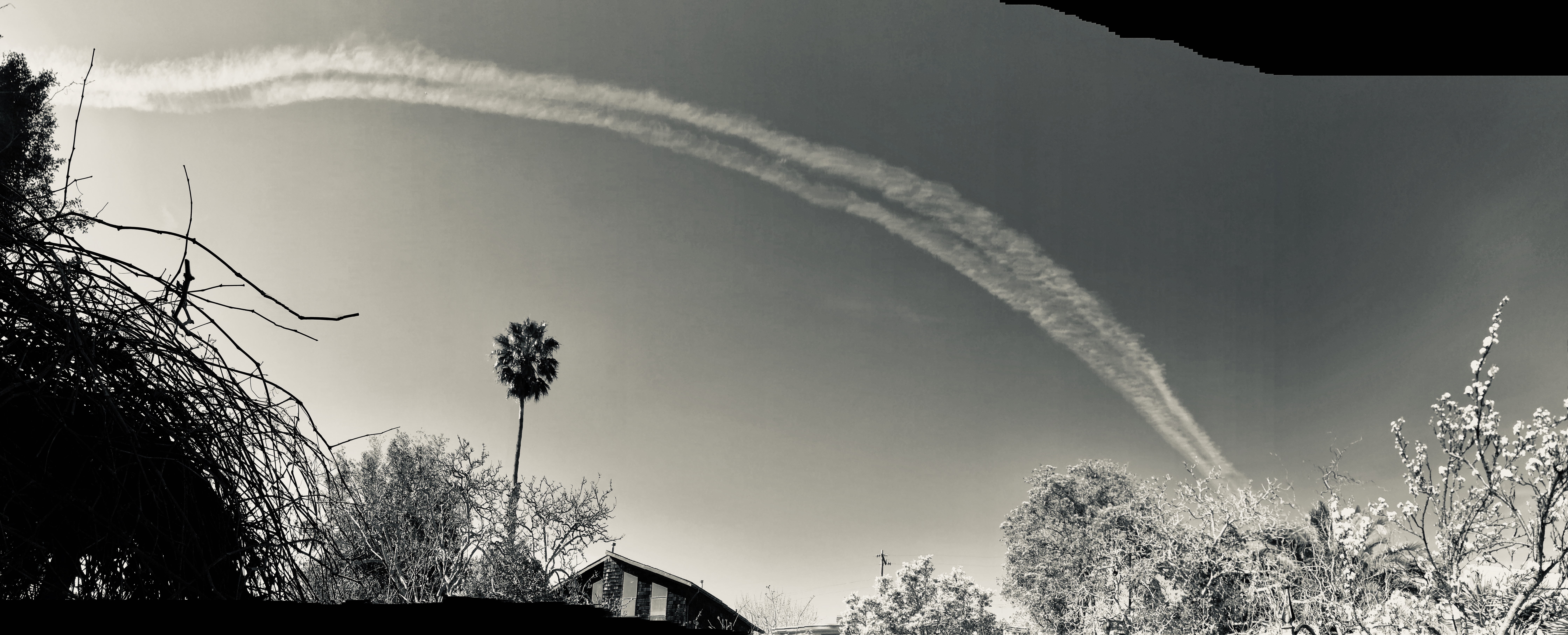 Clouds and sky take on a new and mysterious detention in black and white. This very morning I noticed an interesting Contrail above my backyard. Here’s the panorama I took of it translated into B&W