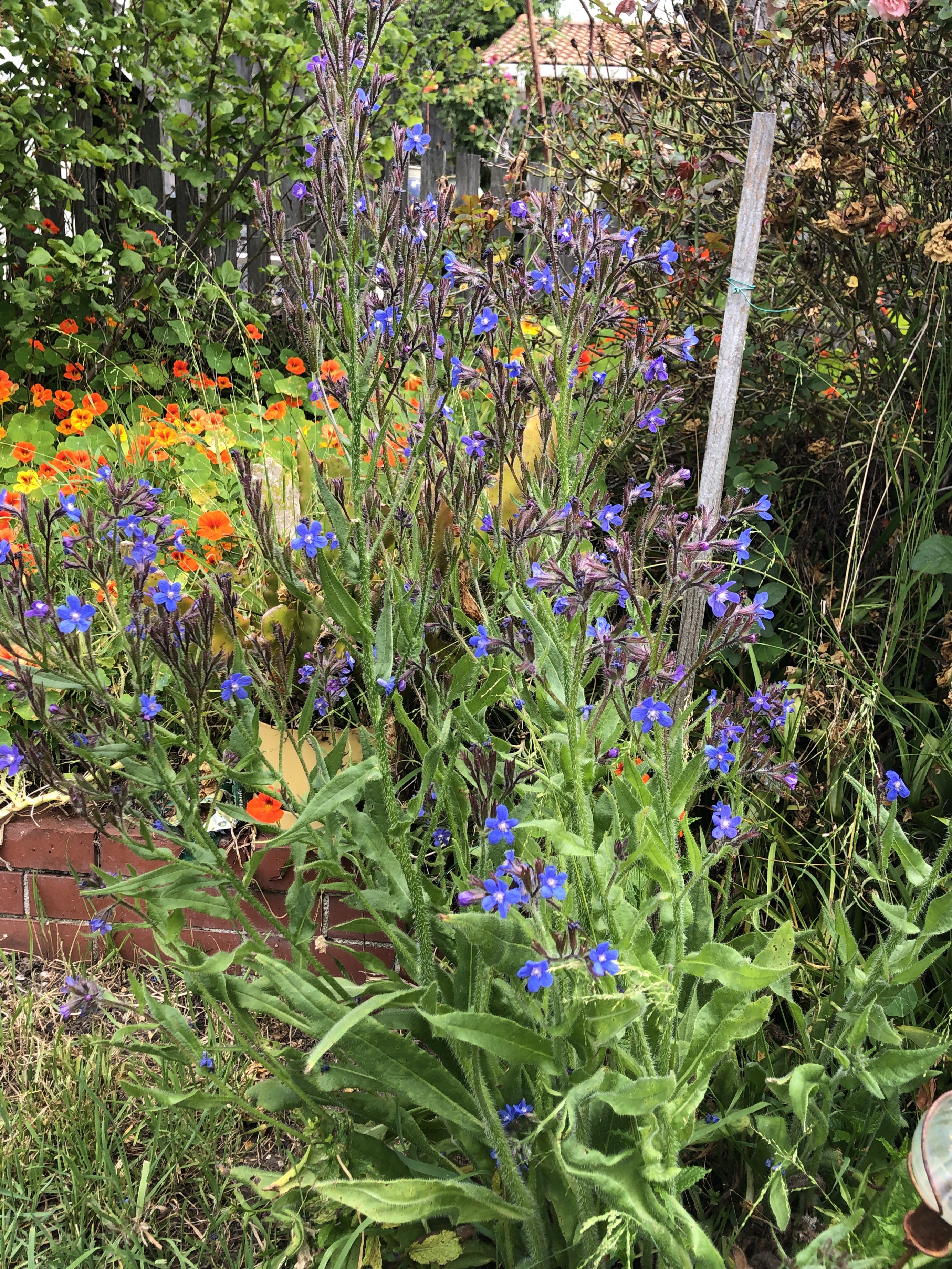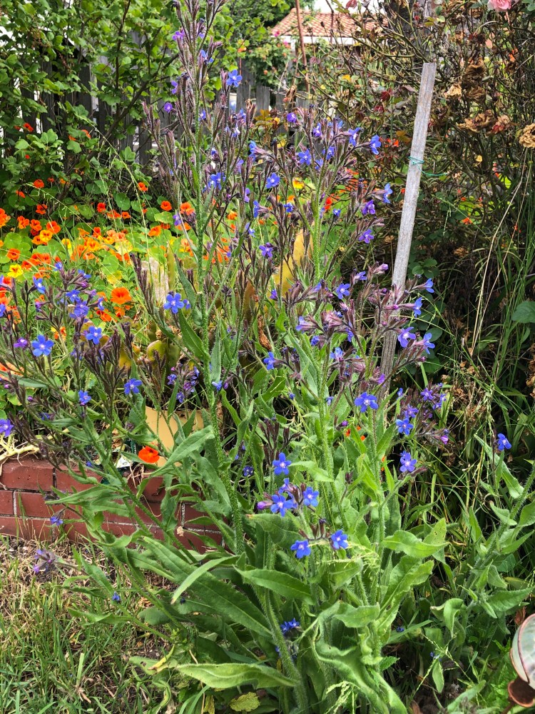 Zucchini blooming before June!You could say I made a “bee line” for it. On the way back inside I passed the tall straight forget-me-not buzzing with fat busy bees.