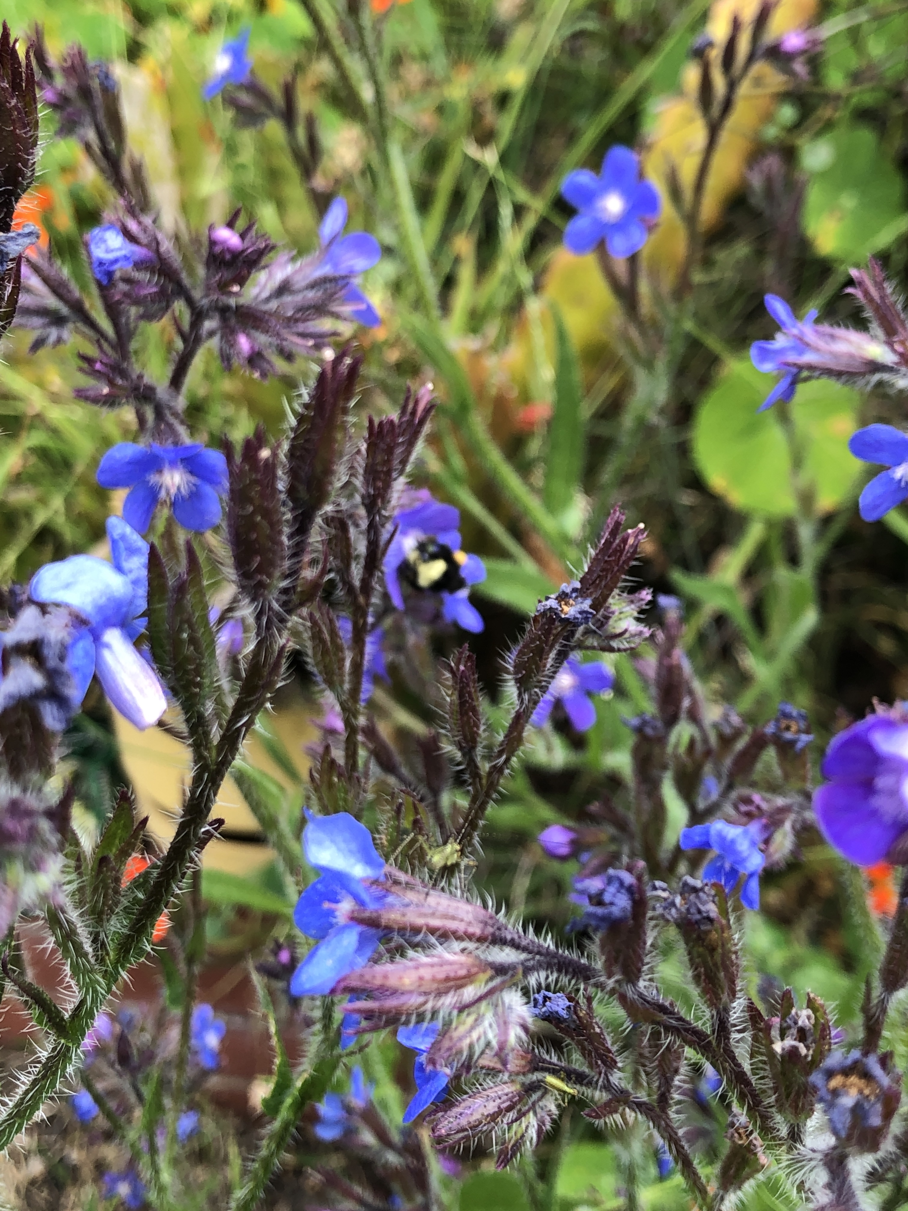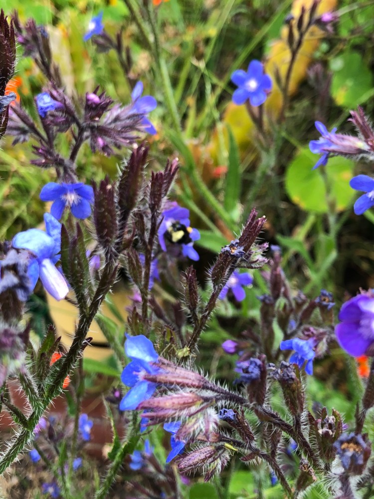 Blue flowers and fuzzy bee