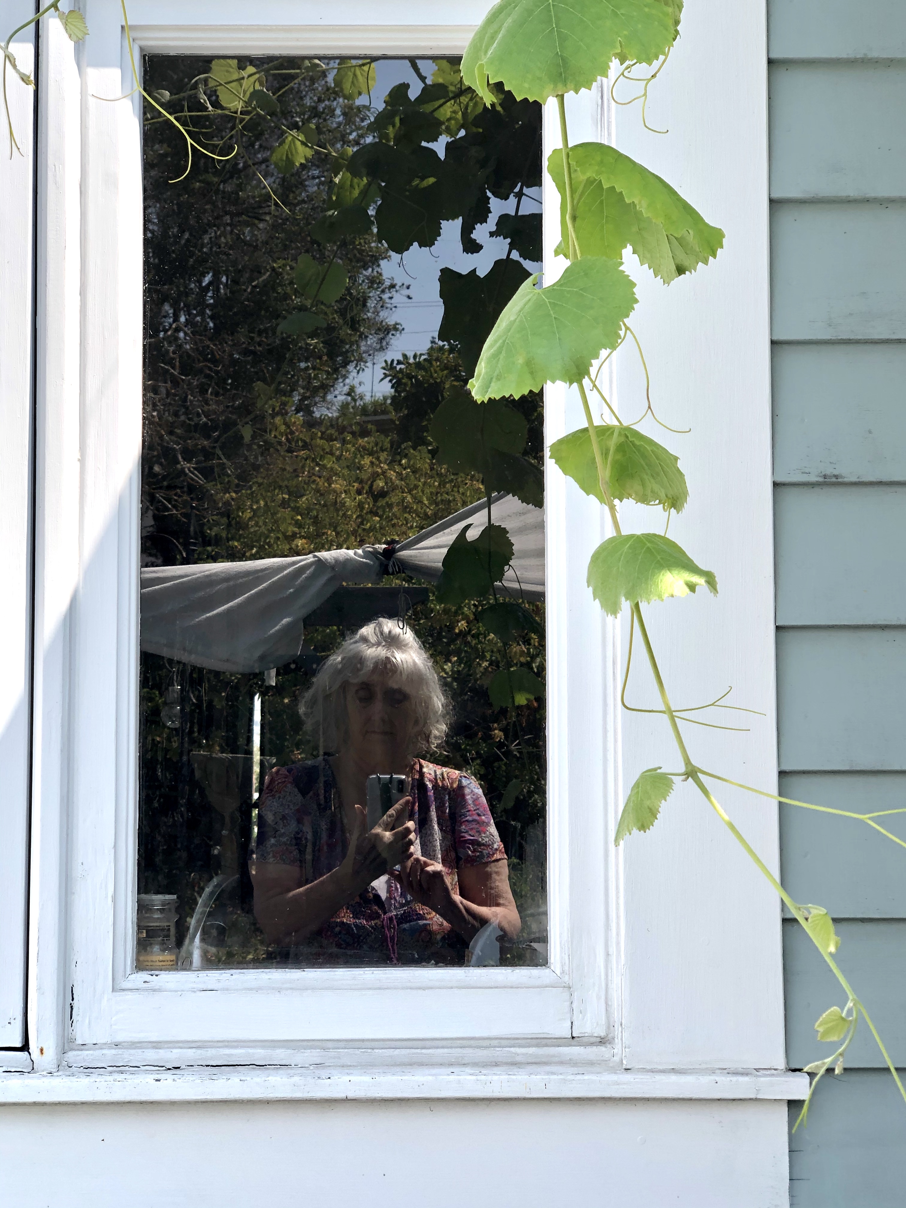 A window makes a good mirror even when that’s not your attention. Here I just was attempting to photograph the grapevine.