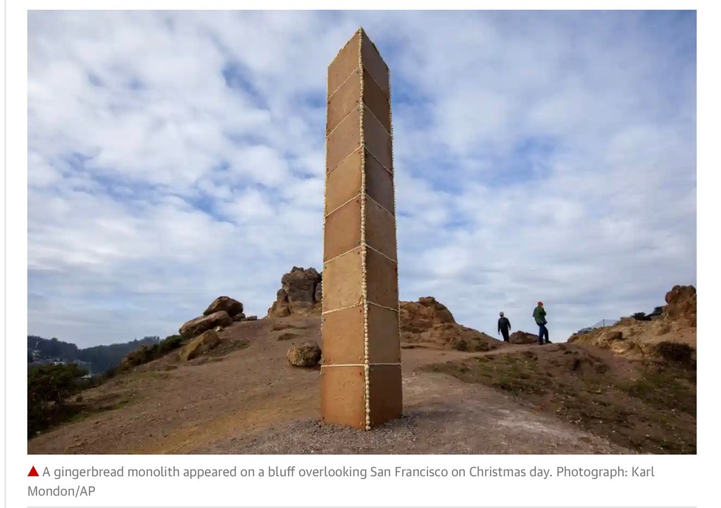 On Christmas Day a Gingerbread monolith appeared on a hill in San Francisco. This is from a news article I thought everyone would enjoy