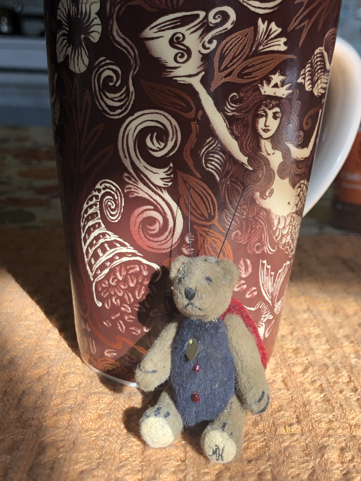 Bear and Starbucks Mermaid Notice all the detail: this is a a handmade bear from a dear friend’s shop, Teddy Bear Go-Round  She is long gone to 100 Acre Wood but her memory lives on.