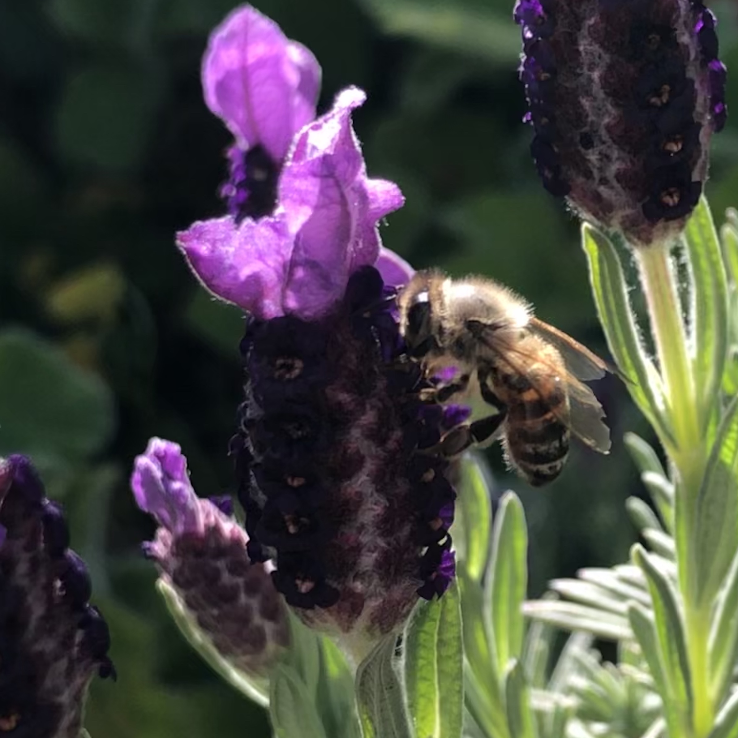I went in close to photograph the Spanish lavender in the bright afternoon sun and was joined by a bee. You could say I was photo bombed by a bee. Of course she added to the beauty of the moment. She stuck around for more portraits.