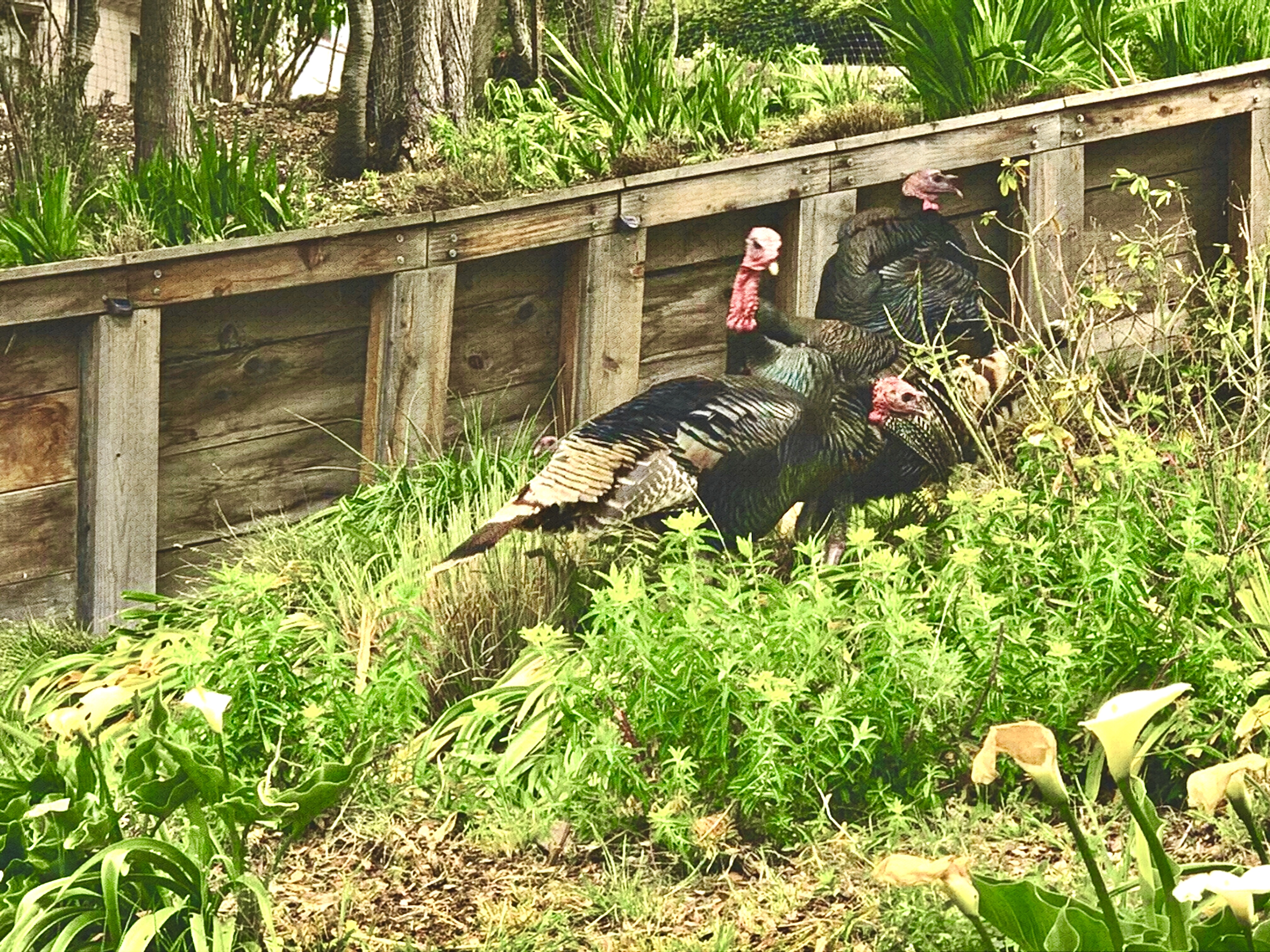 These big birds feathers are extra bright right now because it is mating season so they are showing off to attract a mate. I’m not sure what we will happens if there are any more “not so wild” turkeys around. Here’s the rest of her troupe who think their hidden in the meadow.