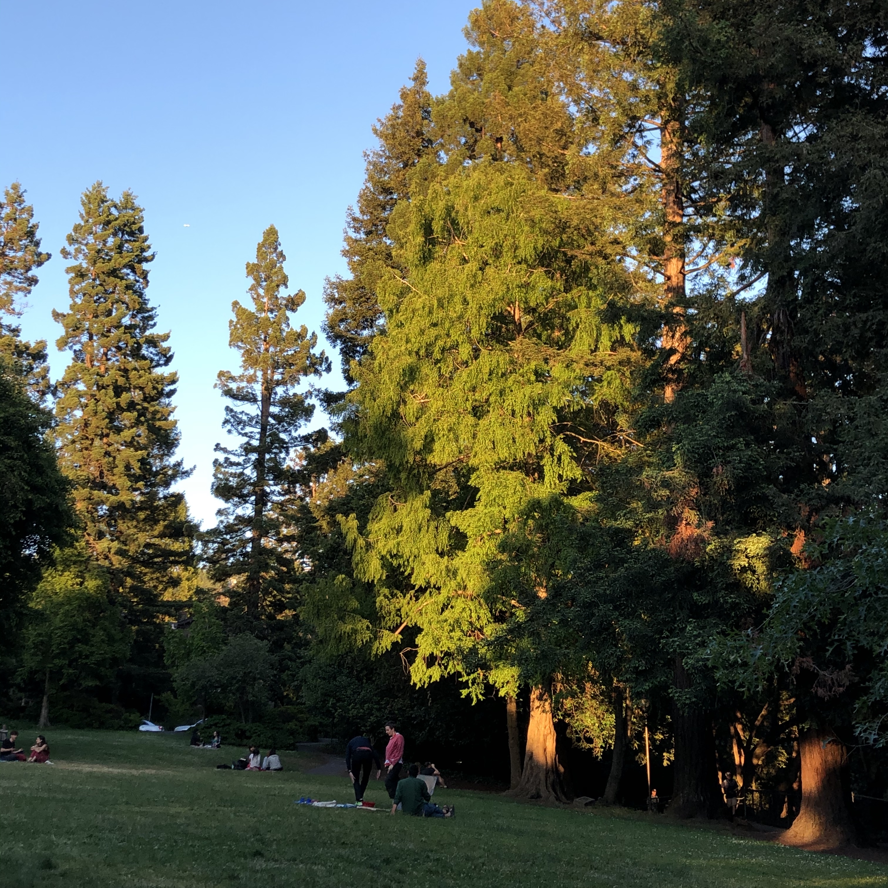Folks enjoying late afternoon sun beneath the Dawn Redwood