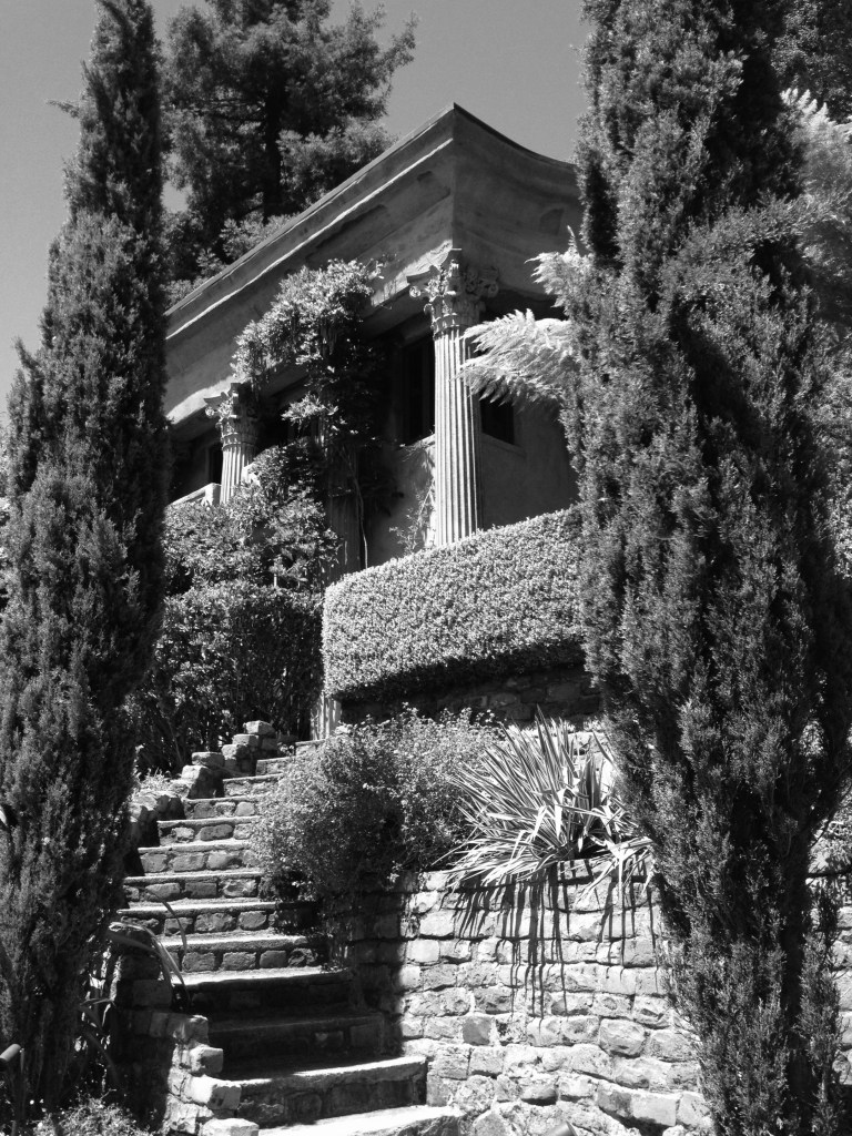 for Cee’s B&W Challenge Steps Inside or Out For this photo of the Temple of The Wings my partner in crime drove all around the Berkeley Hills fallowing Google maps from dead end to another. Finally ignoring a do not enter sign we came upon Isadora Duncan’s beautiful dance school. I hopped out of the car a took a few photos and then we sped away before someone called the cops