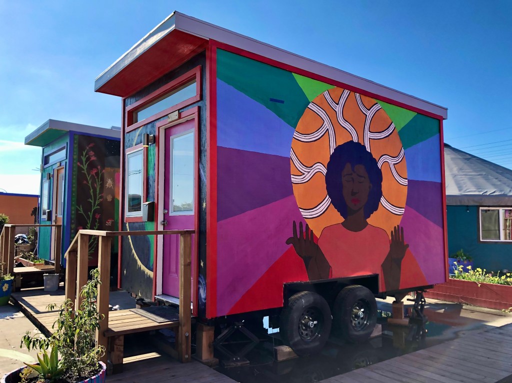 The Tiny House Empowerment village in Oakland CA has Many More than Four Colors on its houses, ground murals and fences and more. The homes are for the much under-served unhoused youth in the Berkeley Oakland area. These are some of photos from a tour I took earlier in December.