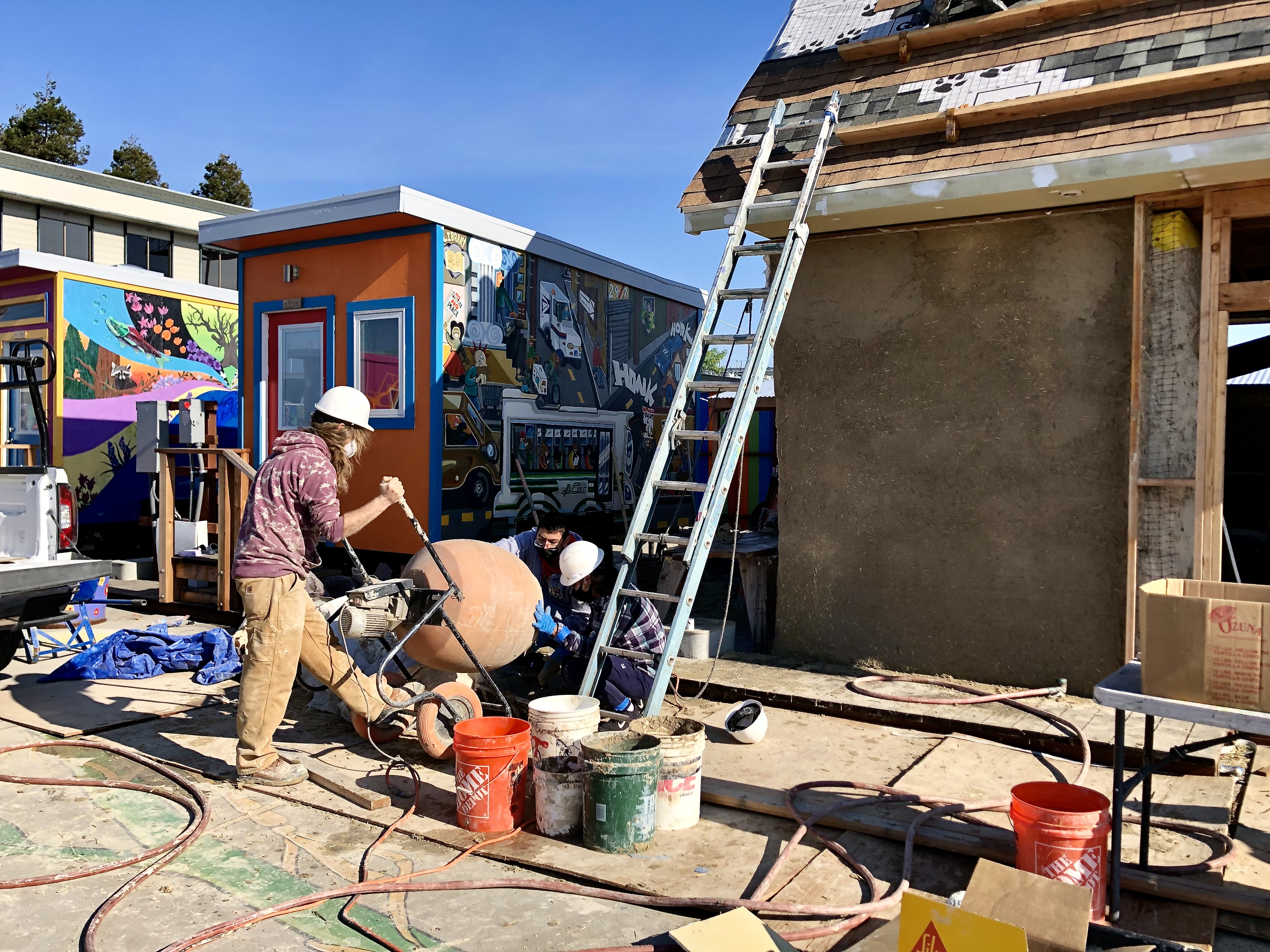 While I was there they were putting what appears to be adobe siding on the new straw bail structure.
