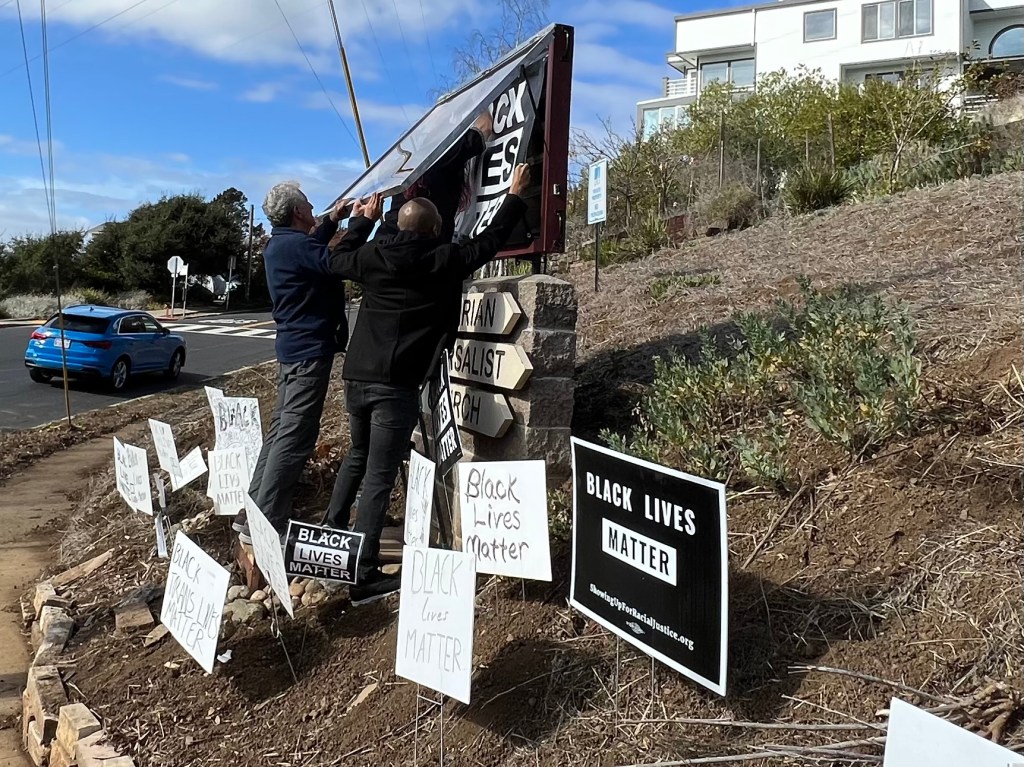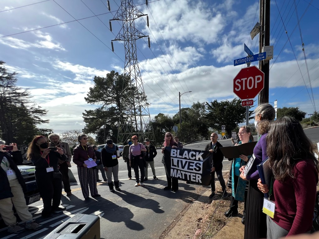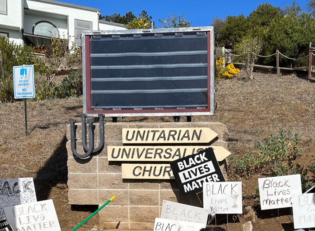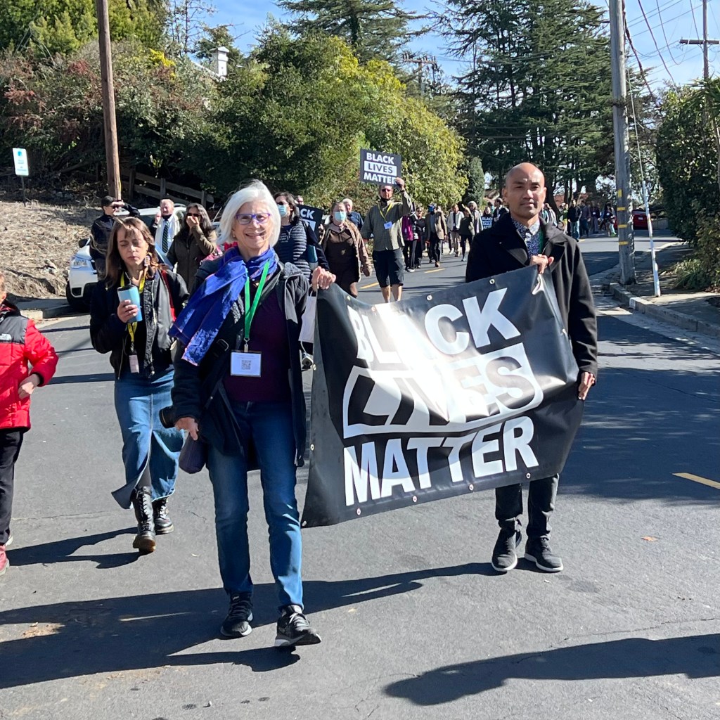 In September the Black Lives Matter sign was badly vandalized November 6th is restored…It was paraded down the hill from The Unitarian Universalist Church of Berkeley, where it was blessed with singing and a poem, before being set in place. Click any image to see full size.