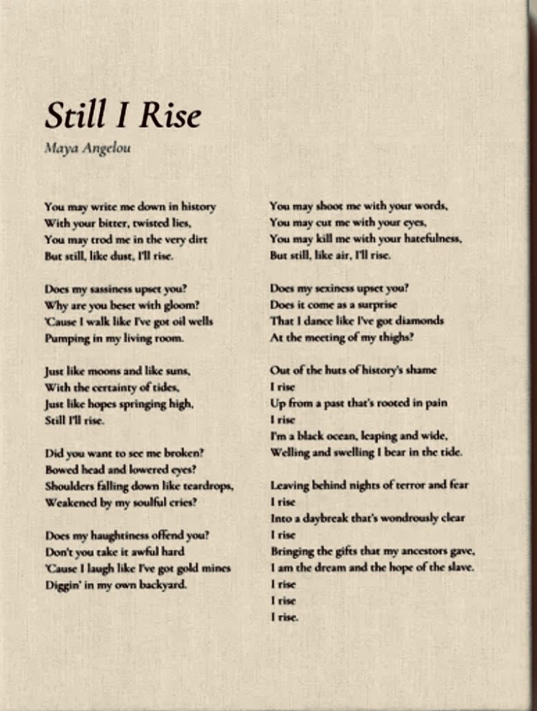 The songs were “Wade in The Water” and “Lift Every Voice and Sing” A group of us read Maya Angelou’s “Still I Rise”.b low are images of the singers and the folks reading the poem