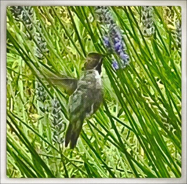 Out my backdoor, through the glass, the hummingbird on the lavender seems appears like a painting…