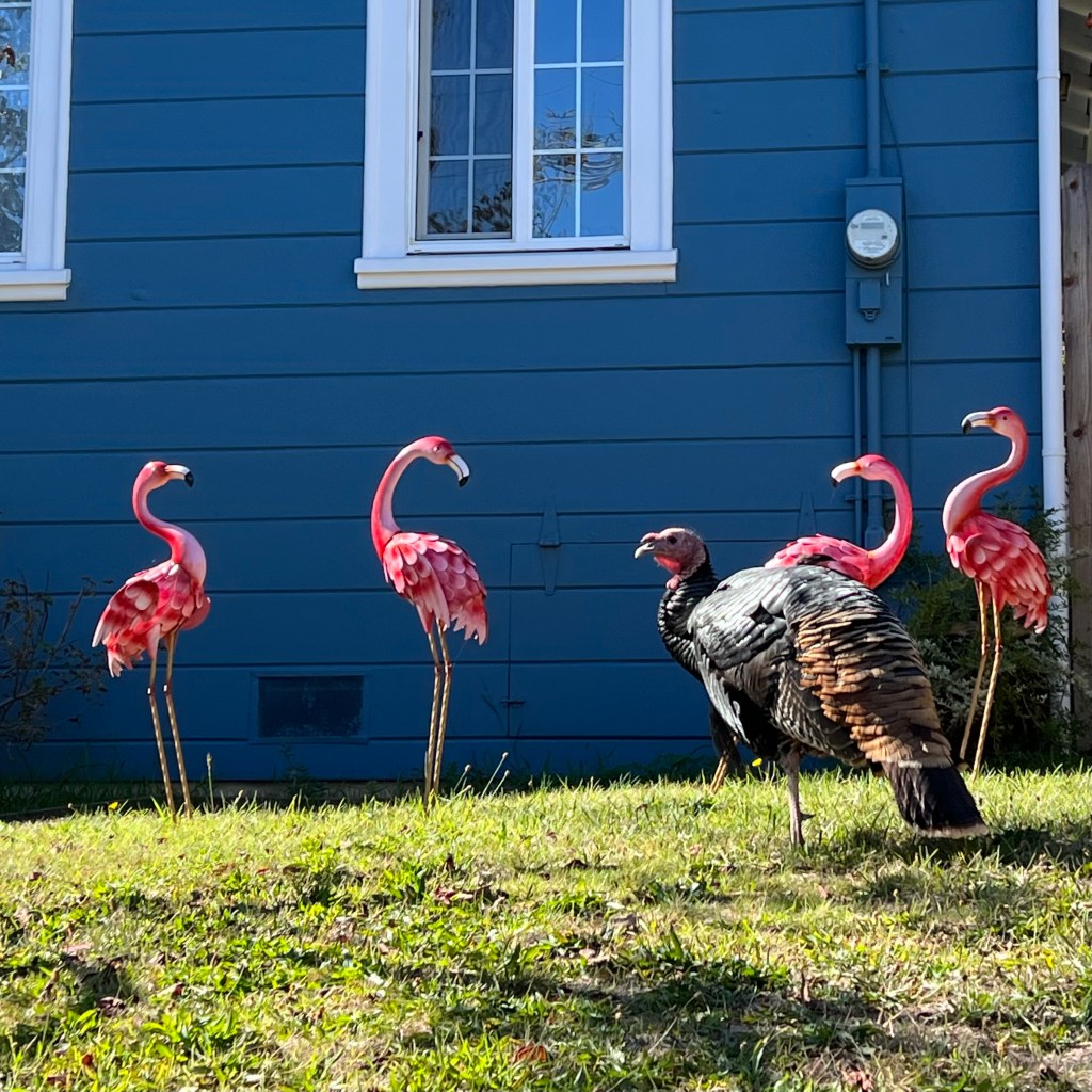 These are great shots, Carol! I love the turkey hanging out with the flamingoes–too funny! Is that a deer crossing the street? It looks almost like a statue, but his feet aren’t touching the ground! Beautiful shot of Jim with Ember.