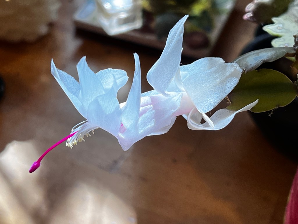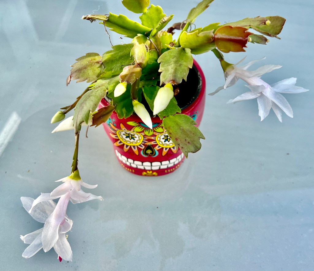 Whatsoever Lovely This Christmas Cactus seems to bloom every October so perhaps it’s a Halloween cactus. Maybe because it lives in a skull pot.