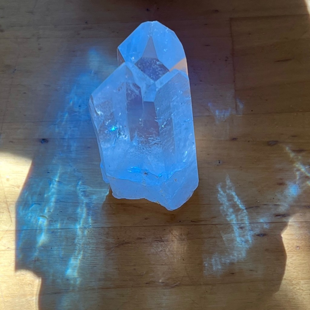 In January the sun comes in at just the right angle (geometry) to light up objects on my “art” table. Today my blue bowl and a quartz crystal took the hit.