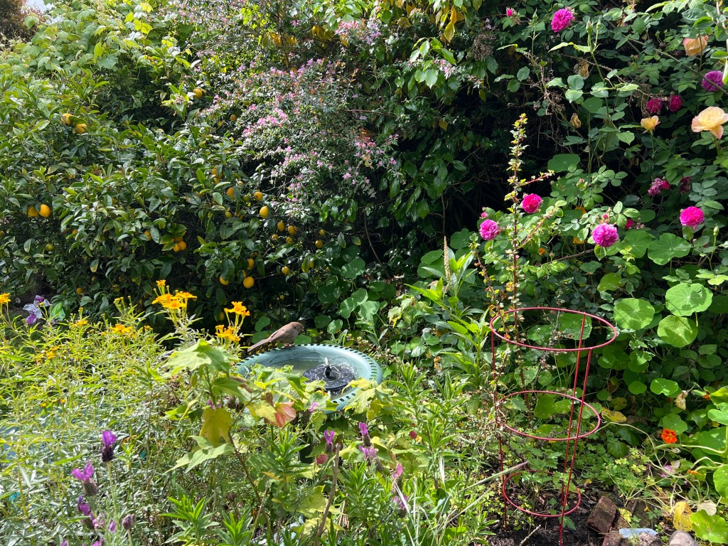 I went out to Photograph my wall of pink roses, and a bird decided to take a bath nearby. That’s when I realized that my whole Garden Is In The Pink